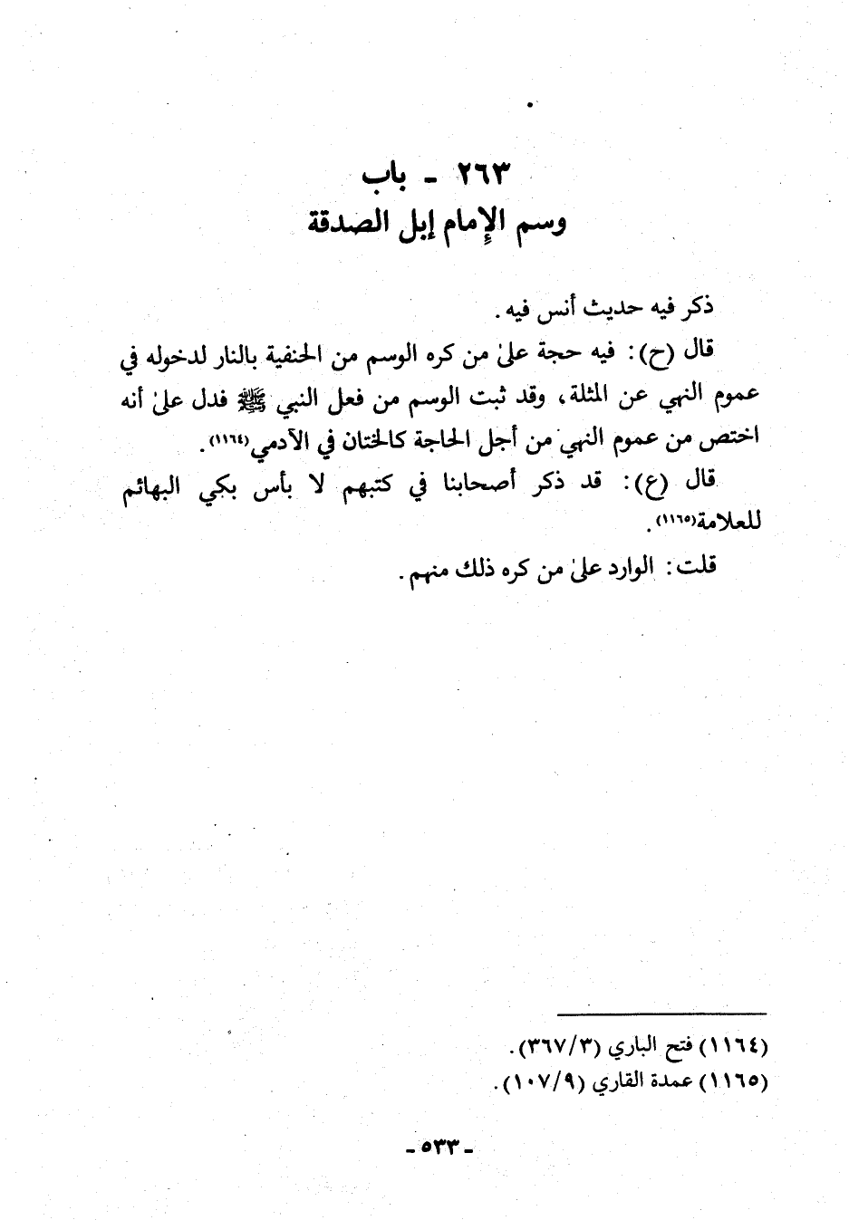 قال (ح): فيه حجة على من كره الوسم من الحنفية بالنار لدخوله في عموم النّهي عن المثلة، وقد ثبت الوسم من فعل النّبيّ - صلّى الله عليه وسلم - فدل على أنّه اختص من عموم النّهي من أجل الحاجة كالختان في الآدمي (¬1164).