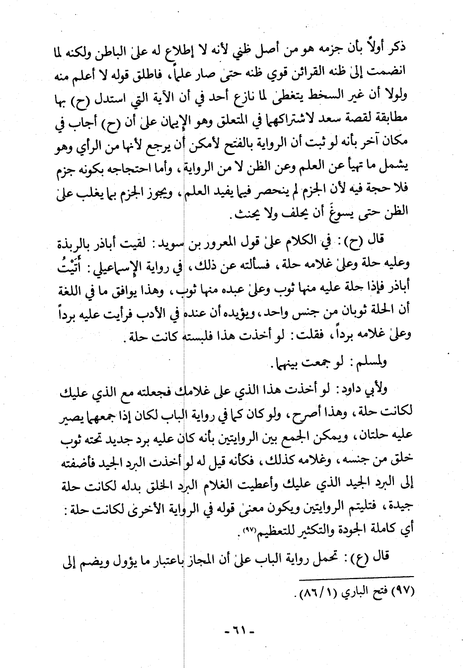 ولأبي داود: لو أخذت هذا الذي على غلامك فجعلته مع الذي عليك لكانت حلة، وهذا أصرح، ولو كان كما في رواية الباب لكان إذا جمعهما يصير عليه حلتان، ويمكن الجمع بين الروايتين بأنّه كان عليه برد جديد تحته ثوب خلق من جنسه، وغلامه كذلك، فكأنّه قيل له لو أخذت البرد الجيد فأضفته إلى البرد الجيد الذي عليك وأعطيت الغلام البرد الخلق بدله لكانت حلة جيدة، فتليتم الروايتين ويكون معنى قوله في الرِّواية الأخرى لكانت حلة: أي كاملة الجودة والتكثير للتعظيم (¬97).