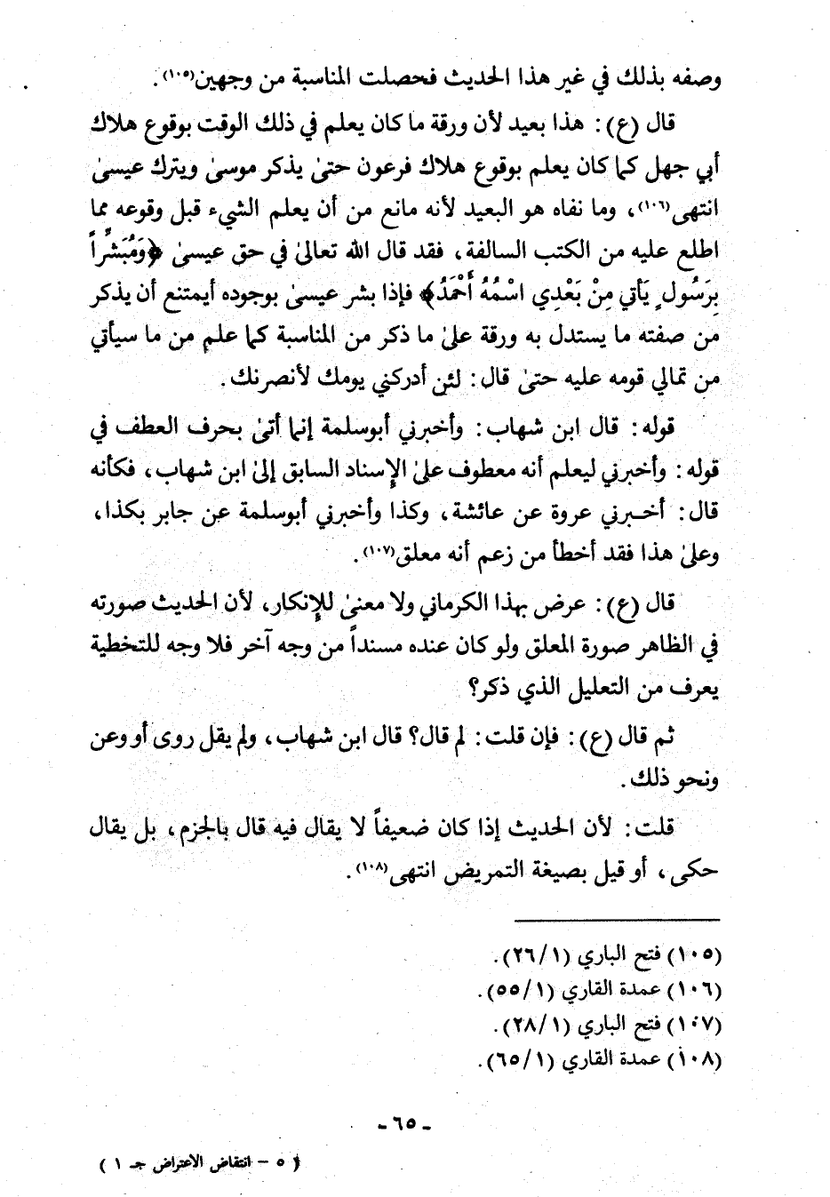 قال (ع): هذا بعيد لأنّ ورقة ما كان يعلم في ذلك الوقت بوقوع هلاك أبي جهل كما كان يعلم بوقوع هلاك فرعون حتّى يذكر موسى ويترك عيسى انتهى (¬106)، وما نفاه هو البعيد لأنّه مانع من أن يعلم الشيء قبل وقوعه ممّا اطلع عليه من الكتب السالفة، فقد قال الله تعالى في حق عيسى {وَمُبَشِّرًا بِرَسُولٍ يَأْتِي مِنْ بَعْدِي اسْمُهُ أَحْمَدُ} فإذا بشر عيسى بوجوده أيمتنع أن يذكر من صفته ما يستدل به ورقة على ما ذكر من المناسبة كما علم من ما سيأتي من تمالي قومه عليه حتّى قال: لئن أدركني يومك لأنصرنك.
