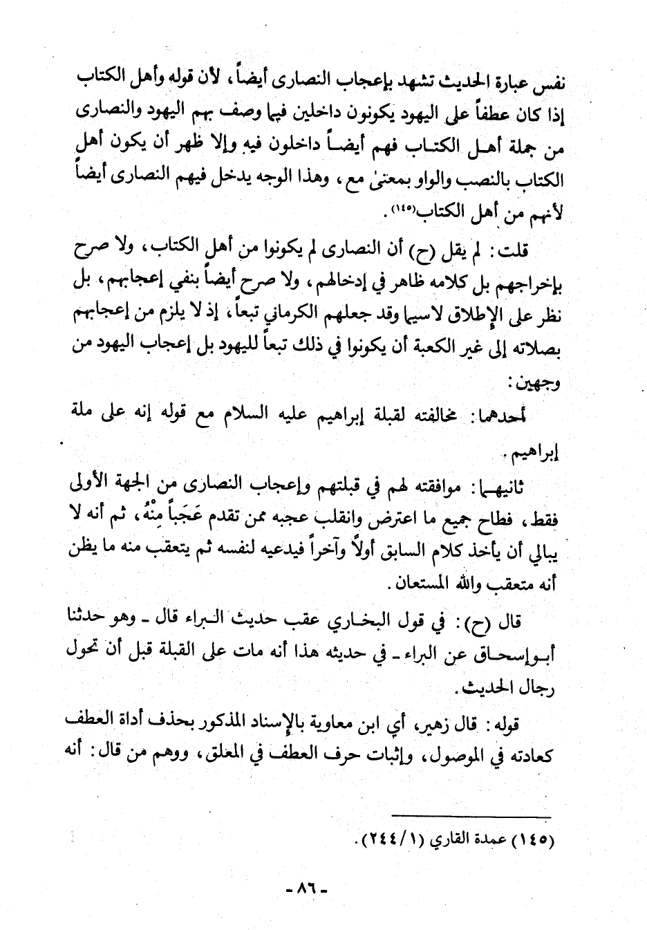 قلت: لم يقل (ح) أن النصارى لم يكونوا في أهل الكتاب، ولا صرح بإخراجهم بل كلامه ظاهر في إدخالهم، ولا صرح أيضًا بنفي إعجابهم، بل نظر على الإطلاق لا سيما وقد جعلهم الكرماني تبعًا، إذ لا يلزم من إعجابهم بصلاته إلى غير الكعبة أن يكونوا في ذلك تبعًا لليهود بل اعجاب اليهود من وجهين: