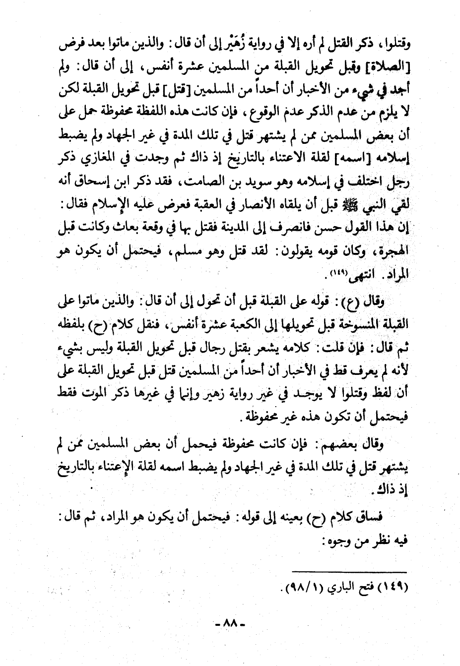 وقال (ع): قوله على القبلة قبل أن تحول إِلى أن قال: والذين ماتوا على القبلة المنسوخة قبل تحويلها إلى الكعبة عشرة أنفس، فنقل كلام (ح) بلفظه ثمّ قال: فإن قلت: كلامه يشعر بقتل رجال قبل تحويل القبلة وليس بشيء لأنّه لم يعرف قط في الأخبار أن أحدًا من المسلمين قتل قبل تحويل القبلة على أن لفظ وقتلوا لا يوجد في غير رواية زهير وإنّما في غيرها ذكر الموت فقط فيحتمل أن تكون هذه غير محفوظة.