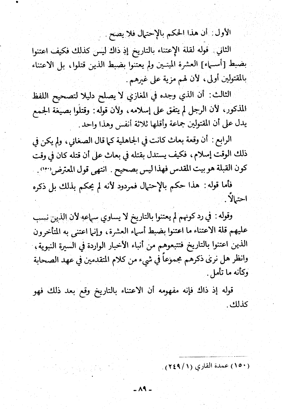 الثّاني. قوله لقلة الإِعتناء بالتاريخ إذ ذاك ليس كذلك فكيف اعتنوا بضبط [أسماء] العشرة الميِّتين ولم يعتنوا بضبط الذين قتلوا، بل الاعتناء بالمقتولين أولى، لأنّ لهم مزية على غيرهم.