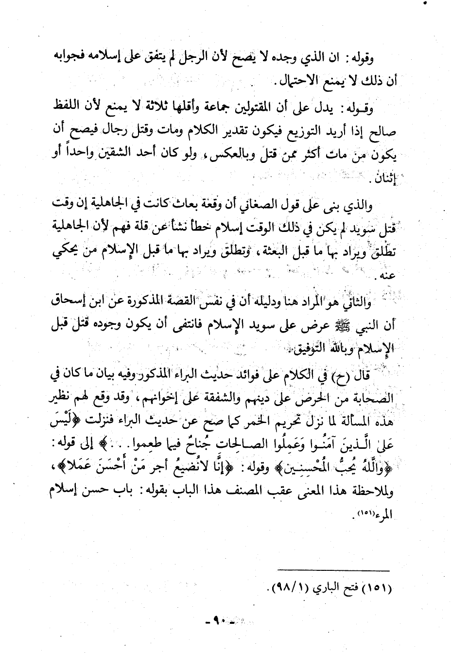 والثّاني هو المراد هنا ودليله أن نفس القصة المذكورة عن ابن إسحاق أن النّبيّ - صلّى الله عليه وسلم - عرض على سُوَيْد الإسلام فانتفى أن يكون وجوده قبل الإِسلام وبالله التوفيق.