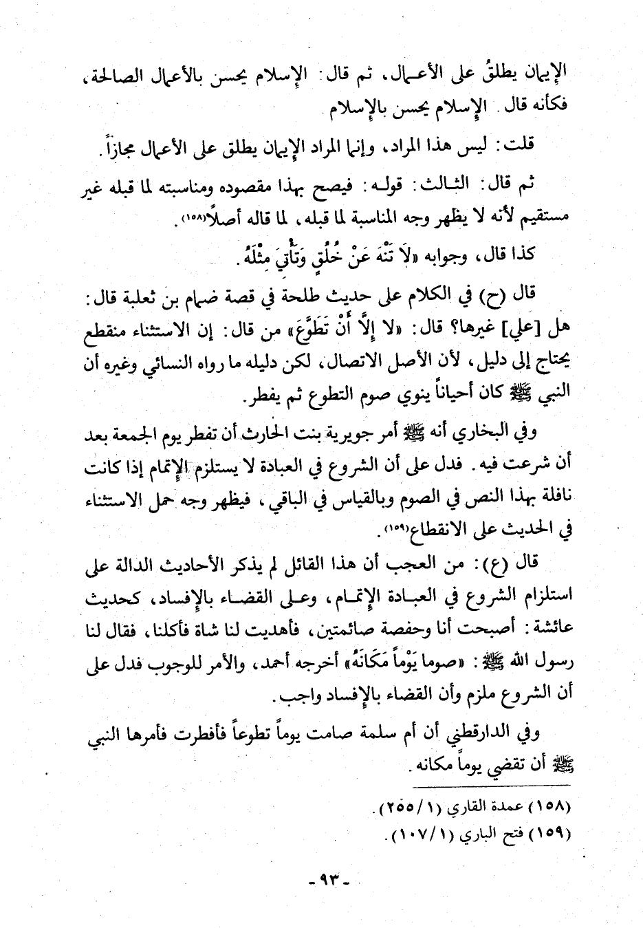 وفي البخاريّ أنّه - صلّى الله عليه وسلم - أمر جويرية بنت الحارث أن تفطر يوم الجمعة بعد أن شرعت فيه. فدل على أن الشروع في العبادة لا يستلزم الإِتمام إذا كانت نافلة بهذا النص في الصوم وبالقياس في الباقي، فيظهر وجه حمل الاستثناء في الحديث على الانقطاع (¬159).