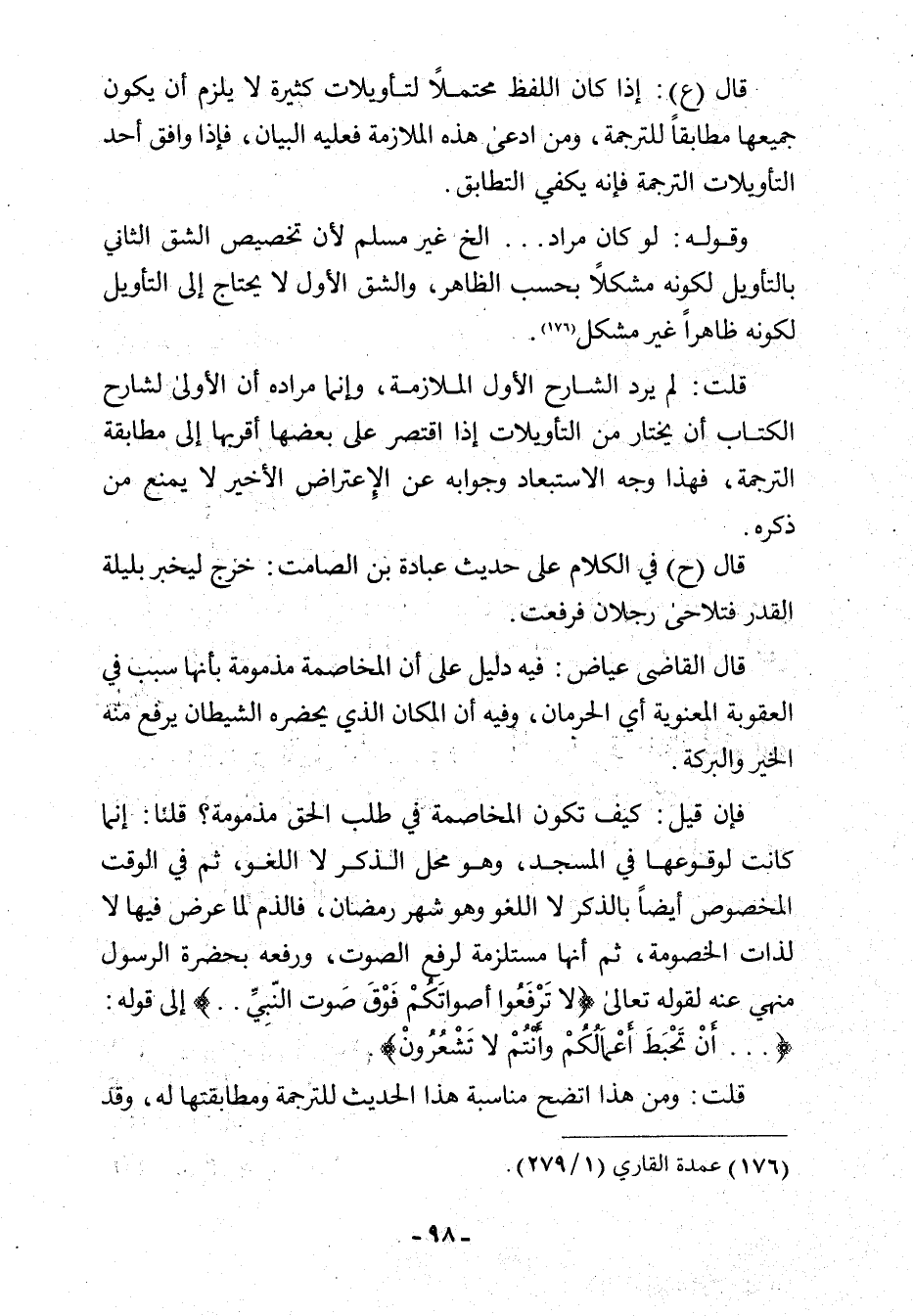فإن قيل: كيف تكون المخاصمة في طلب الخق مذمومة؟ قلنا: إنّما كانت لوقوعها في المسجد، وهو محل الذكر لا اللغو، ثمّ في الوقت المخصوص أيضًا بالذكر لا اللغو وهو شهر رمضان، فالذم لما عرض فيها لا لذات الخصومة، ثمّ إنّها مستلزمة لرفع الصوت، ورفعه بحضرة الرسول منهي عنه لقوله تعالى {لَا تَرْفَعُوا أَصْوَاتَكُمْ فَوْقَ صَوْتِ النَّبِيِّ ..} إلى قوله: {.. أَنْ تَحْبَطَ أَعْمَالُكُمْ وَأَنْتُمْ لَا تَشْعُرُونَ}.