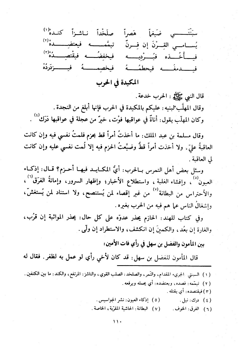 وسئل بعض أهل التمرس بالحرب: أيّ المكايد فيها أحزم؟ قال: إذكاء العيون «5» ، وإفشاء الغلبة، واستطلاع الأخبار؛ وإظهار السرور، وإماتة الفرق «6» ، والاحتراس من البطانة «7» من غير إقصاء لمن يستنصح، ولا استناد لمن يستغشّ، وإشغال الناس عما هم فيه من الحرب بغيره.