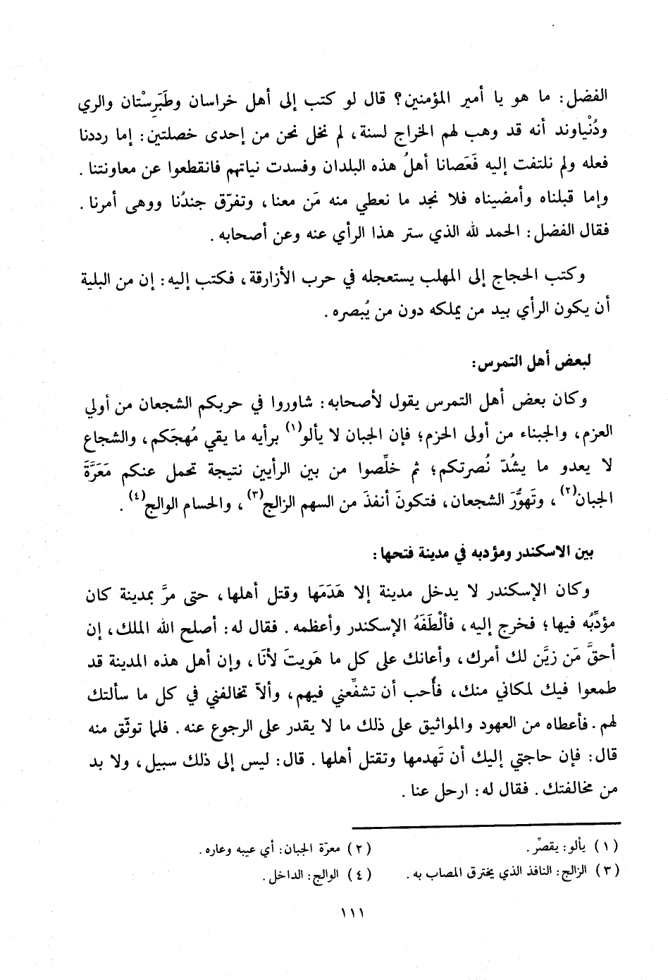 : وكان بعض أهل التمرس يقول لأصحابه: شاوروا في حربكم الشجعان من أولي العزم، والجبناء من أولى الحزم؛ فإن الجبان لا يألو «1» برأيه ما يقي مهجكم، والشجاع لا يعدو ما يشدّ نصرتكم؛ ثم خلّصوا من بين الرأيين نتيجة تحمل عنكم معرّة الجبان «2» ، وتهوّر الشجعان، فتكون أنفذ من السهم الزالج «3» ، والحسام الوالج «4» .