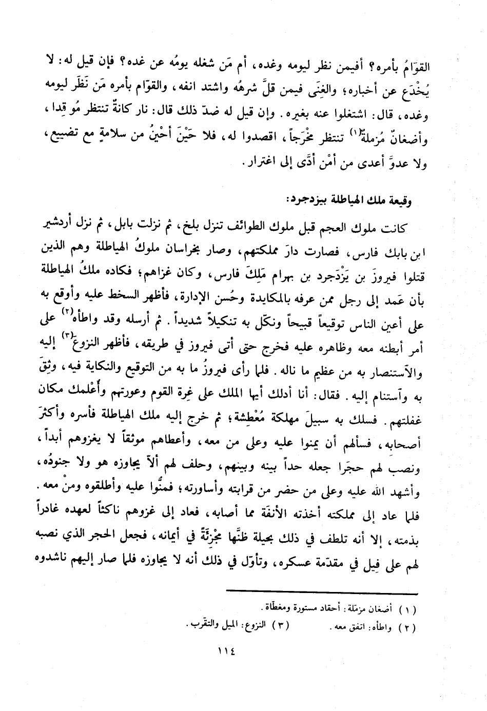 : كانت ملوك العجم قبل ملوك الطوائف تنزل بلخ، ثم نزلت بابل، ثم نزل أردشير ابن بابك فارس، فصارت دار مملكتهم، وصار بخراسان ملوك الهياطلة وهم الذين قتلوا فيروز بن يزدجرد بن بهرام ملك فارس، وكان غزاهم؛ فكاده ملك الهياطلة بأن عمد إلى رجل ممن عرفه بالمكايدة وحسن الإدارة، فأظهر السخط عليه وأوقع به على أعين الناس توقيعا قبيحا ونكّل به تنكيلا شديدا. ثم أرسله وقد واطأه «2» على أمر أبطنه معه وظاهره عليه فخرج حتى أتى فيروز في طريقه، فأظهر النزوع «3» إليه والاستنصار به من عظيم ما ناله. فلما رأى فيروز ما به من التوقيع والنكاية فيه، وثق به واستنام إليه. فقال: أنا أدلك أيها الملك على غرة القوم وعورتهم وأعلمك مكان غفلتهم. فسلك به سبيل مهلكة معطشة؛ ثم خرج إليه ملك الهياطلة فأسره وأكثر أصحابه، فسألهم أن يمنوا عليه وعلى من معه، وأعطاهم موثقا لا يغزوهم أبدا، ونصب لهم حجرا جعله حدا بينه وبينهم، وحلف لهم ألّا يجاوزه هو ولا جنوده، وأشهد الله عليه وعلى من حضر من قرابته وأساورته؛ فمنّوا عليه وأطلقوه ومن معه.