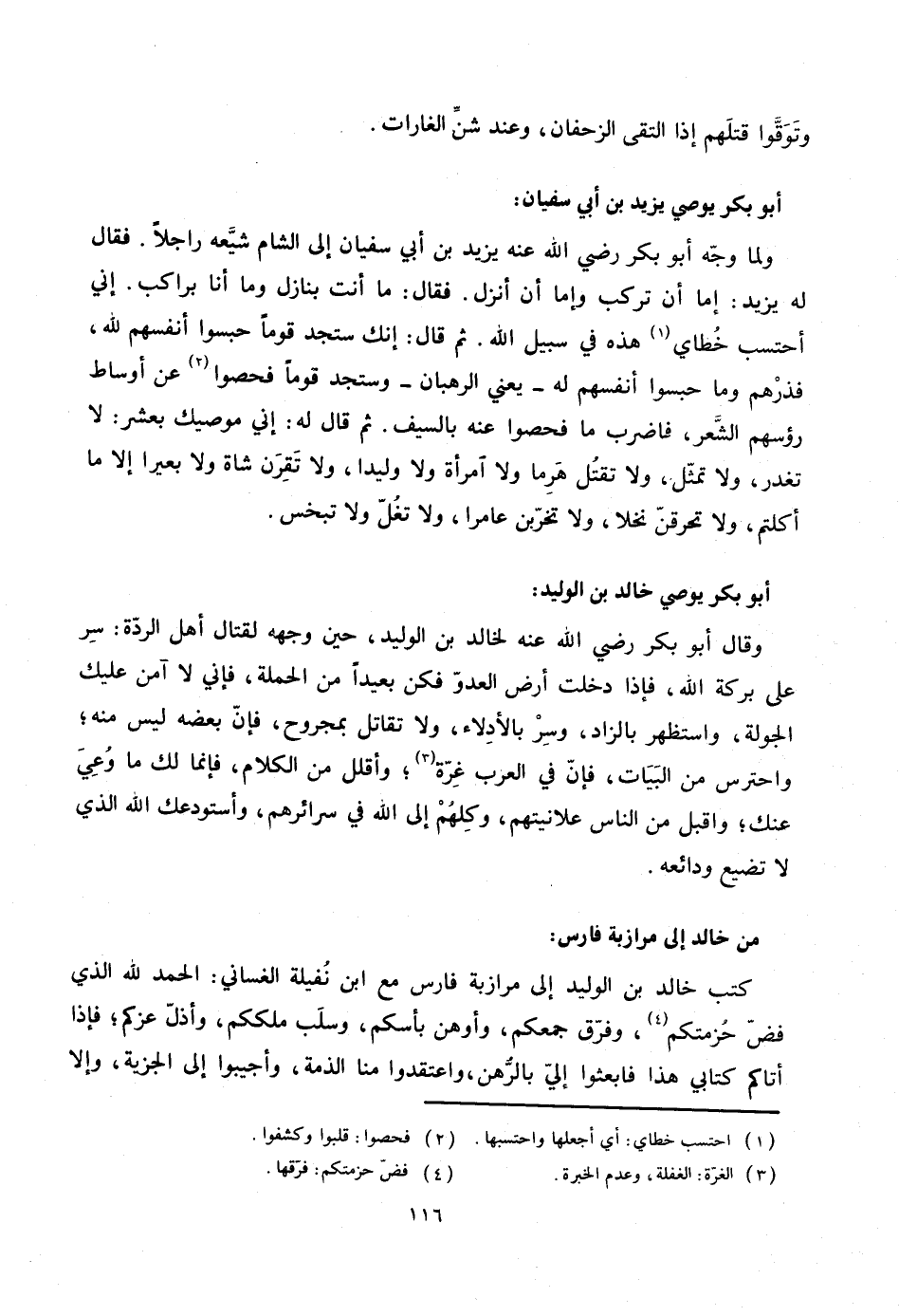 : ولما وجّه أبو بكر رضي الله عنه يزيد بن أبي سفيان إلى الشام شيّعه راجلا. فقال له يزيد: إما أن تركب وإما أن أنزل. فقال: ما أنت بنازل وما أنا براكب. إني أحتسب خطاي «1» هذه في سبيل الله. ثم قال: إنك ستجد قوما حبسوا أنفسهم لله، فذرهم وما حبسوا أنفسهم له- يعني الرهبان- وستجد قوما فحصوا «2» عن أوساط رؤسهم الشّعر، فاضرب ما فحصوا عنه بالسيف. ثم قال له: إني موصيك بعشر: لا تغدر، ولا تمثّل، ولا تقتل هرما ولا امرأة ولا وليدا، ولا تقرن شاة ولا بعيرا إلا ما أكلتم، ولا تحرقنّ نخلا، ولا تخرّبن عامرا، ولا تغلّ ولا تبخس.