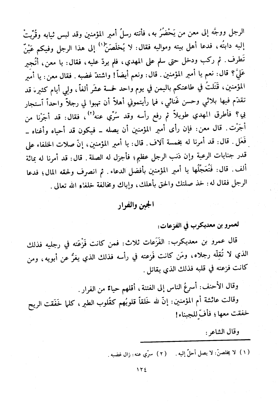: قال عمرو بن معديكرب: الفزعات ثلاث: فمن كانت فزعته في رجليه فذلك الذي لا تقلّه رجلاه، ومن كانت فزعته في رأسه فذلك الذي يفرّ عن أبويه، ومن كانت فزعته في قلبه فذلك الذي يقاتل.