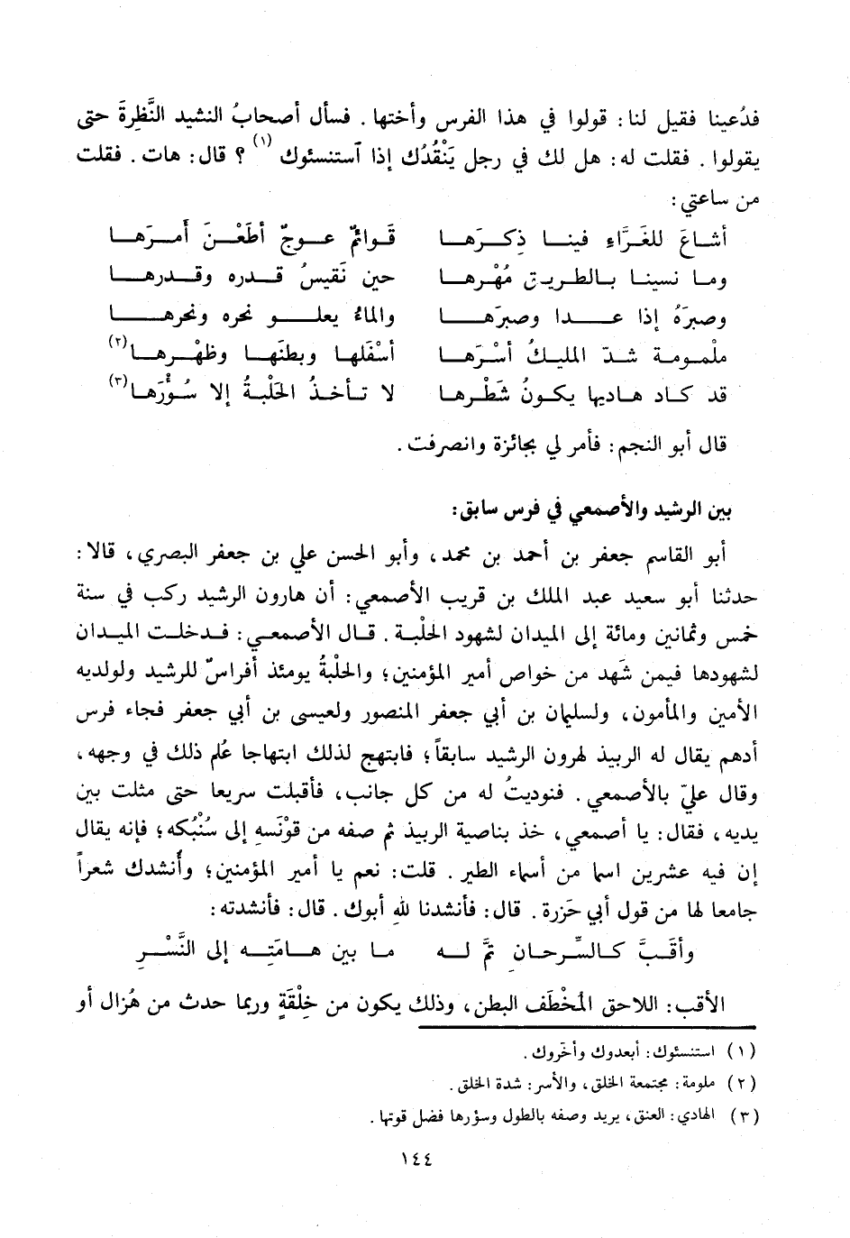 فدعينا فقيل لنا: قولوا في هذا الفرس وأختها. فسأل أصحاب النشيد النّظرة حتى يقولوا. فقلت له: هل لك في رجل ينقدك إذا استنسئوك «1» ؟ قال: هات. فقلت من ساعتي: