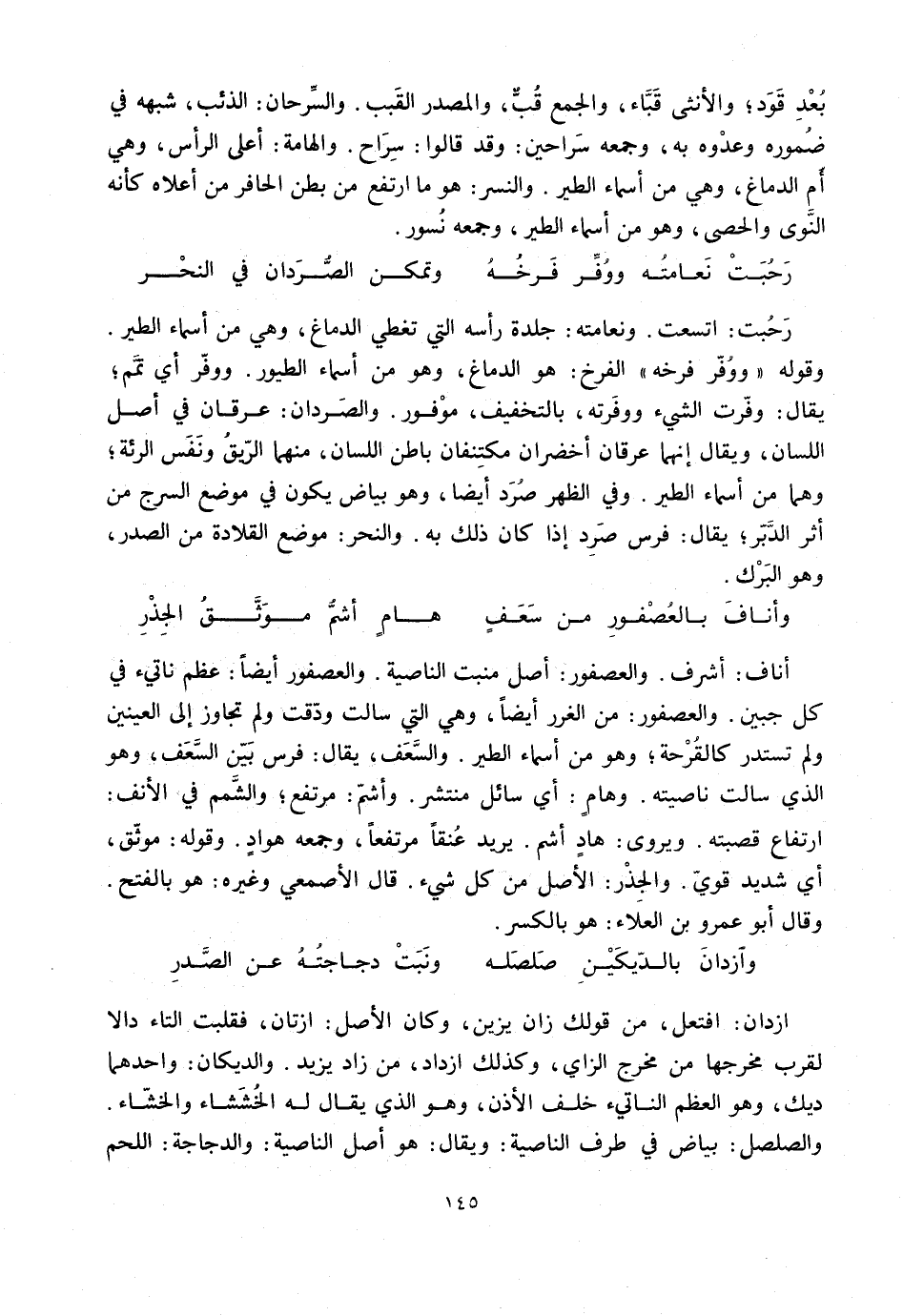 وقوله «ووفّر فرخه» الفرخ: هو الدماغ، وهو من أسماء الطيور، ووفّر أي تمّم؛ يقال: وفّرت الشيء ووفرته، بالتخفيف، موفور. والصردان: عرقان في أصل اللسان، ويقال إنهما عرقان أخضران مكتنفان باطن اللسان، منهما الرّيق ونفس الرئة؛ وهما من أسماء الطير. وفي الظهر صرد أيضا، وهو بياض يكون في موضع السرج من أثر الدّبّر؛ يقال: فرس صرد إذا كان ذلك به. والنحر: موضع القلادة من الصدر، وهو البرك.