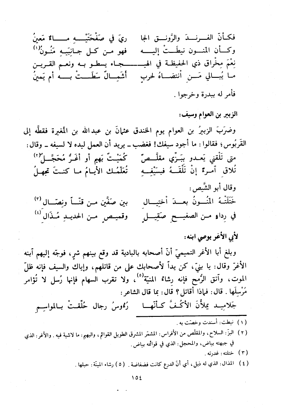 : وبلغ أبا الأغر التميميّ أنّ أصحابه بالبادية قد وقع بينهم شر، فوجّه إليهم ابنه الأغرّ وقال: يا بنيّ، كن يدا لأصحابك على من قاتلهم، وإياك والسيف فإنه ظلّ الموت، واتق الرّمح فإنه رشاء المنيّة «5» ، ولا تقرب السهام فإنها رسل لا تؤامر مرسلها. قال: فماذا أقاتل؟ قال: بما قال الشاعر: