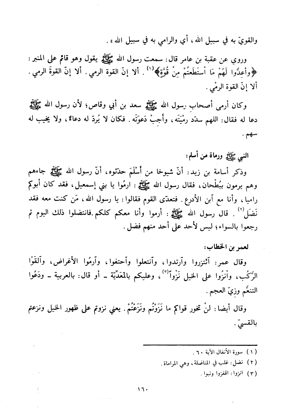 : وذكر أسامة بن زيد: أنّ شيوخا من أسلم حدّثوه، أنّ رسول الله صلّى الله عليه وسلّم جاءهم وهم يرمون ببطحان، فقال رسول الله صلّى الله عليه وسلّم: ارموا يا بني إسمعيل، فقد كان أبوكم راميا، وأنا مع ابن الأدرع. فتعدّى القوم فقالوا: يا رسول الله، من كنت معه فقد نضل «2» . قال رسول الله صلّى الله عليه وسلّم: أرموا وأنا معكم كلكم. فانتضلوا ذلك اليوم ثم رجعوا بالسواء؛ ليس لأحد على أحد منهم فضل.