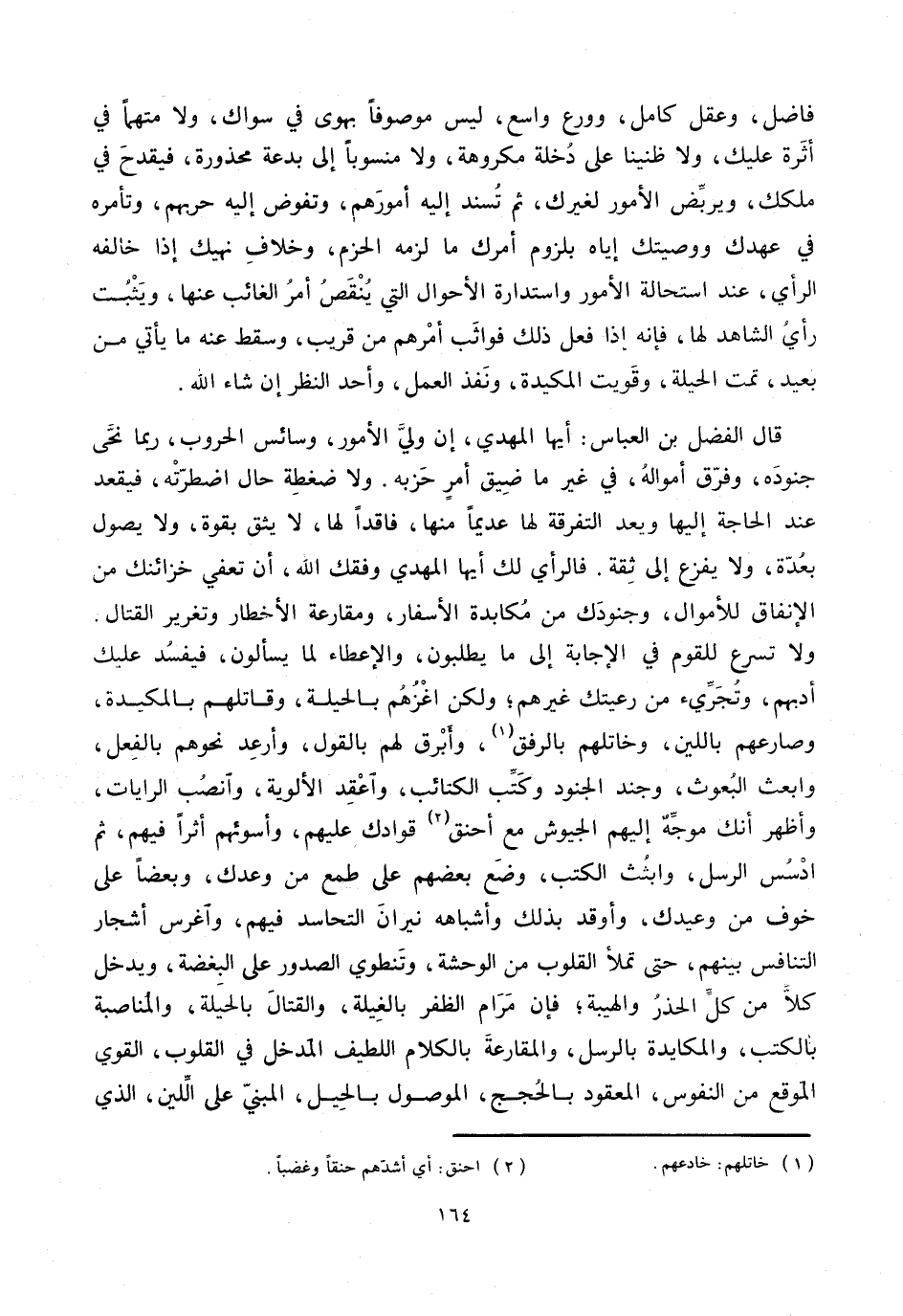 فاضل، وعقل كامل، وورع واسع، ليس موصوفا بهوى في سواك، ولا متهما في أثرة عليك، ولا ظنينا على دخلة مكروهة، ولا منسوبا إلى بدعة محذورة، فيقدح في ملكك، ويربّض الأمور لغيرك، ثم تسند إليه أمورهم، وتفوض إليه حربهم، وتأمره في عهدك ووصيتك إياه بلزوم أمرك ما لزمه الحزم، وخلاف نهيك إذا خالفه الرأي، عند استحالة الأمور واستدارة الأحوال التي ينقص أمر الغائب عنها، ويثبت رأي الشاهد لها، فإنه إذا فعل ذلك فواثب أمرهم من قريب، وسقط عنه ما يأتي من بعيد، تمت الحيلة، وقويت المكيدة، ونفذ العمل، وأحد النظر إن شاء الله.