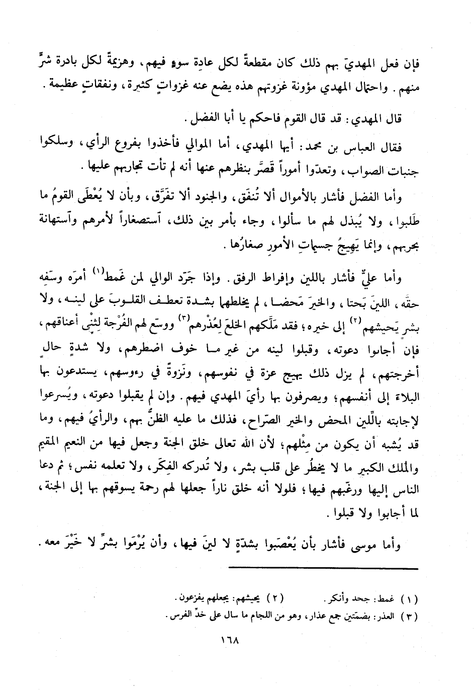 فقال العباس بن محمد: أيها المهدي، أما الموالي فأخذوا بفروع الرأي، وسلكوا جنبات الصواب، وتعدّوا أمورا قصّر بنظرهم عنها أنه لم تأت تجاربهم عليها.