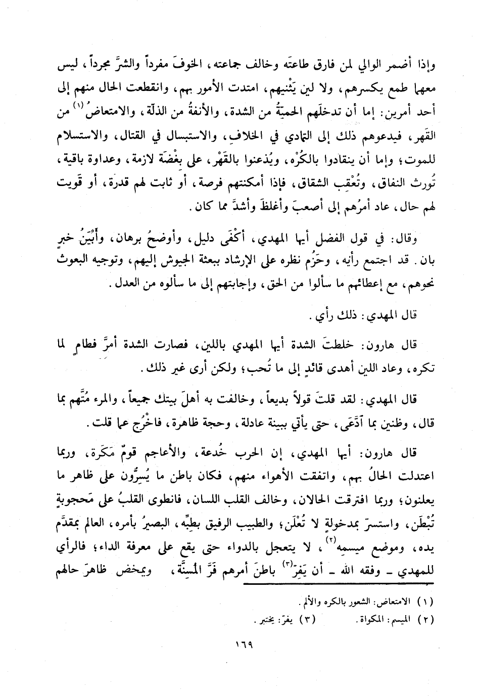 قال هارون: أيها المهدي، إن الحرب خدعة، والأعاجم قوم مكرة، وربما اعتدلت الحال بهم، واتفقت الأهواء منهم، فكان باطن ما يسرّون على ظاهر ما يعلنون؛ وربما افترقت الحالان، وخالف القلب اللسان، فانطوى القلب على محجوبة تبطن، واستسرّ بمدخولة لا تعلن؛ والطبيب الرفيق بطبّه، البصير بأمره، العالم بمقدّم يده، وموضع ميسمه «2» ، لا يتعجل بالدواء حتى يقع على معرفة الداء؛ فالرأي للمهدي- وفقه الله- أن يفرّ «3» باطن أمرهم فرّ المسنّة، ويمخض ظاهر حالهم