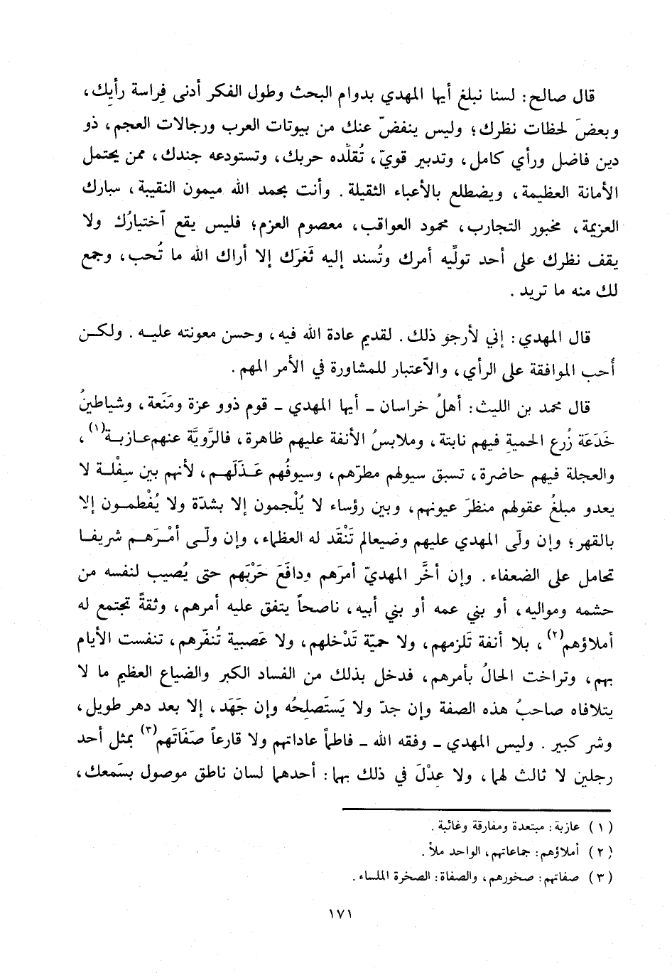 قال صالح: لسنا نبلغ أيها المهدي بدوام البحث وطول الفكر أدنى فراسة رأيك، وبعض لحظات نظرك؛ وليس ينفضّ عنك من بيوتات العرب ورجالات العجم، ذو دين فاضل ورأي كامل، وتدبير قويّ، تقلده حربك، وتستودعه جندك، ممن يحتمل الأمانة العظيمة، ويضطلع بالأعباء الثقيلة. وأنت بحمد الله ميمون النقيبة، مبارك العزيمة، مخبور التجارب، محمود العواقب، معصوم العزم؛ فليس يقع اختيارك ولا يقف نظرك على أحد تولّيه أمرك وتسند إليه ثغرك إلا أراك الله ما تحب، وجمع لك منه ما تريد.