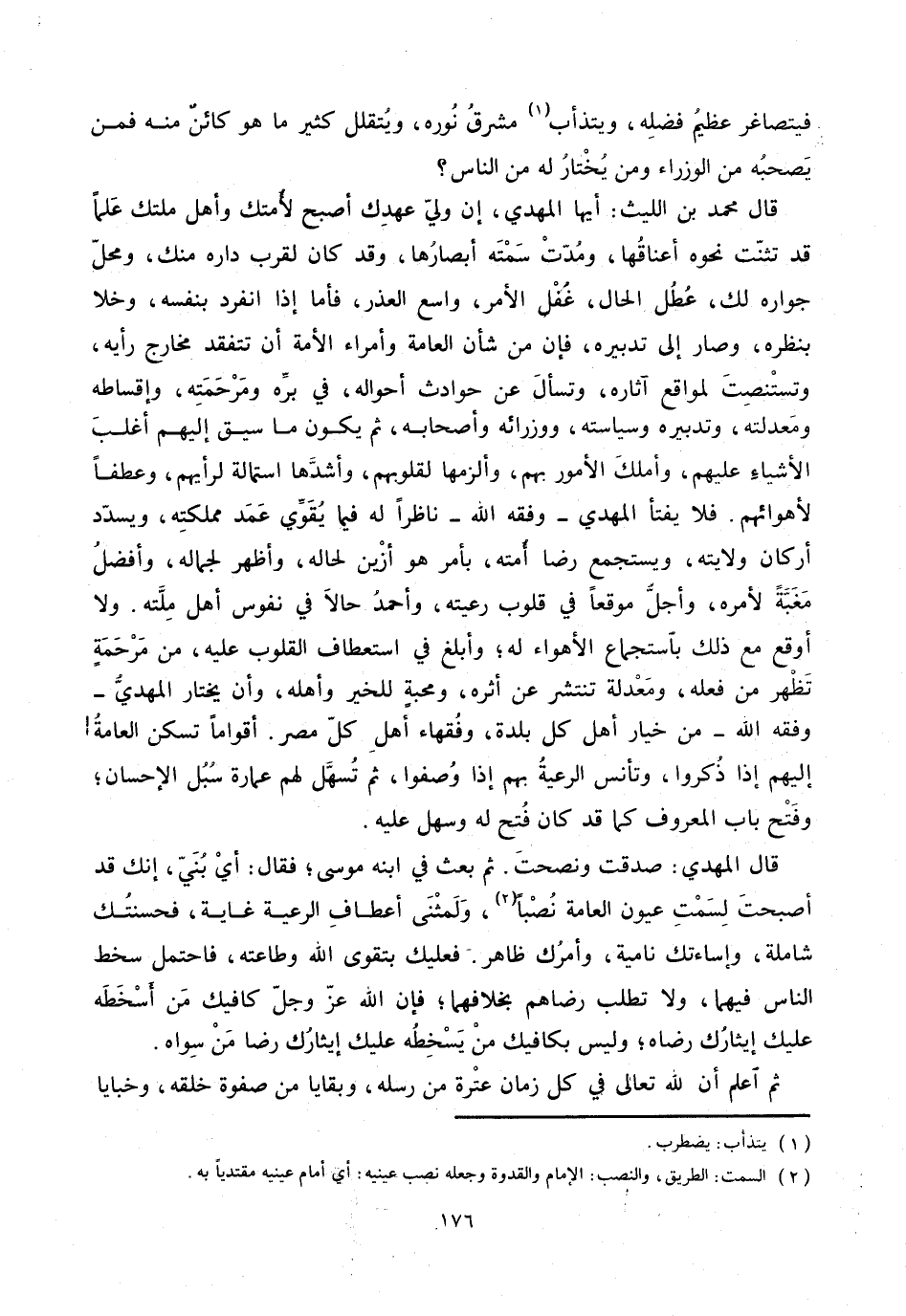 قال محمد بن الليث: أيها المهدي، إن وليّ عهدك أصبح لأمتك وأهل ملتك علما قد تثنّت نحوه أعناقها، ومدّت سمته أبصارها، وقد كان لقرب داره منك، ومحلّ جواره لك، عطل الحال، غفل الأمر، واسع العذر، فأما إذا انفرد بنفسه، وخلا بنظره، وصار إلى تدبيره، فإن من شأن العامة وأمراء الأمة أن تتفقد مخارج رأيه، وتستنصت لمواقع آثاره، وتسأل عن حوادث أحواله، في برّه ومرحمته، وإقساطه ومعدلته، وتدبيره وسياسته، ووزرائه وأصحابه، ثم يكون ما سيق إليهم أغلب الأشياء عليهم، وأملك الأمور بهم، وألزمها لقلوبهم، وأشدّها استمالة لرأيهم، وعطفا لأهوائهم. فلا يفتأ المهدي- وفقه الله- ناظرا له فيما يقوّي عمد مملكته، ويسدّد أركان ولايته، ويستجمع رضا أمته، بأمر هو أزين لحاله، وأظهر لجماله، وأفضل مغبّة لأمره، وأجلّ موقعا في قلوب رعيته، وأحمد حالا في نفوس أهل ملّته. ولا أوقع مع ذلك باستجماع الأهواء له؛ وأبلغ في استعطاف القلوب عليه، من مرحمة تظهر من فعله، ومعدلة تنتشر عن أثره، ومحبة للخير وأهله، وأن يختار المهديّ- وفقه الله- من خيار أهل كل بلدة، وفقهاء أهل كلّ مصر. أقواما تسكن العامة إليهم إذا ذكروا، وتأنس الرعية بهم إذا وصفوا، ثم تسهّل لهم عمارة سبل الإحسان؛ وفتح باب المعروف كما قد كان فتح له وسهل عليه.