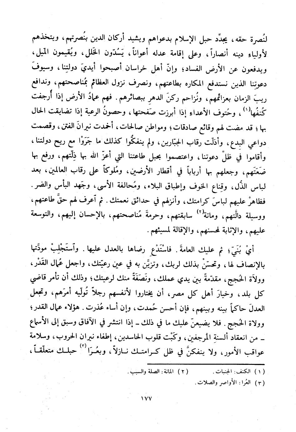 أي بنيّ؛ ثم عليك العامة. فاستدع رضاها بالعدل عليها. واستجلب مودّتها بالإنصاف لها، وتحسّن بذلك لربك، وتزيّن به في عين رعيّتك، واجعل عمال القدر، وولاة الحجج، مقدّمة بين يدي عملك، ونصفة منك لرعيتك؛ وذلك أن تأمر قاضي كل بلد، وخيار أهل كل مصر، أن يختاروا لأنفسهم رجلا تولّيه أمرهم، وتجعل العدل حاكما بينه وبينهم، فإن أحسن حمدت، وإن أساء عذرت. هؤلاء عمال القدر؛ وولاة الحجج. فلا يضيعنّ عليك ما في ذلك- إذا انتشر في الآفاق وسبق إلى الأسماع- من انعقاد ألسنة المرجفين، وكبت قلوب الحاسدين، إطفاء نيران الحروب، وسلامة عواقب الأمور، ولا ينفكنّ في ظل كرامتك نازلا، وبعرا «3» حبلك متعلّقا،