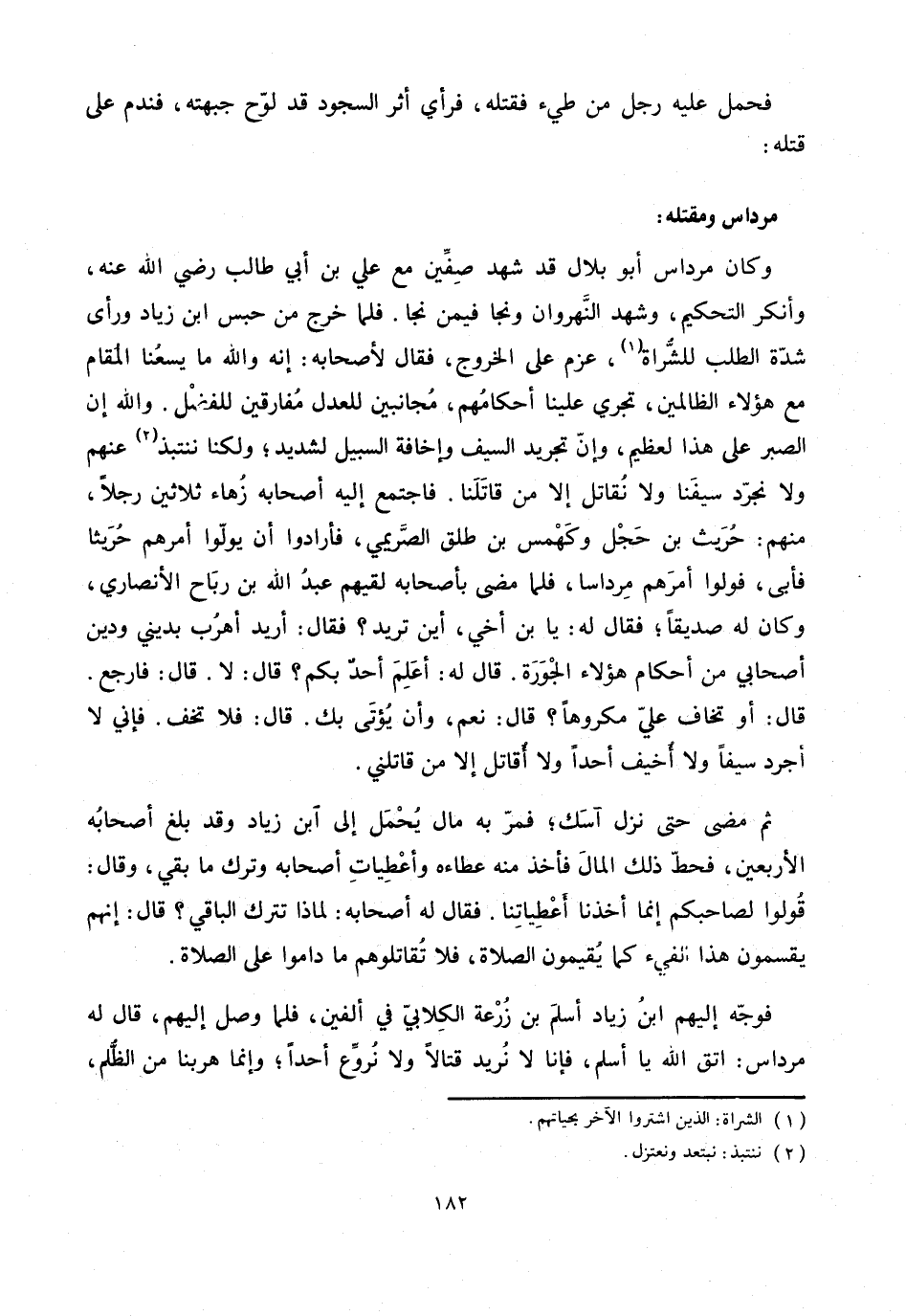 : وكان مرداس أبو بلال قد شهد صفّين مع علي بن أبي طالب رضي الله عنه، وأنكر التحكيم، وشهد النّهروان ونجا فيمن نجا. فلما خرج من حبس ابن زياد ورأى شدّة الطلب للشّراة «1» ، عزم على الخروج، فقال لأصحابه: إنه والله ما يسعنا المقام مع هؤلاء الظالمين، تجري علينا أحكامهم، مجانبين للعدل مفارقين للفضل. والله إن الصبر على هذا لعظيم، وإنّ تجريد السيف وإخافة السبيل لشديد؛ ولكنا ننتبذ «2» عنهم ولا نجرّد سيفنا ولا نقاتل إلا من قاتلنا. فاجتمع إليه أصحابه زهاء ثلاثين رجلا، منهم: حريث بن حجل وكهمس بن طلق الصّريمي، فأرادوا أن يولّوا أمرهم حريثا فأبى، فولوا أمرهم مرداسا، فلما مضى بأصحابه لقيهم عبد الله بن رباح الأنصاري، وكان له صديقا؛ فقال له: يا بن أخي، أين تريد؟ فقال: أريد أهرب بديني ودين أصحابي من أحكام هؤلاء الجورة. قال له: أعلم أحد بكم؟ قال: لا. قال: فارجع.