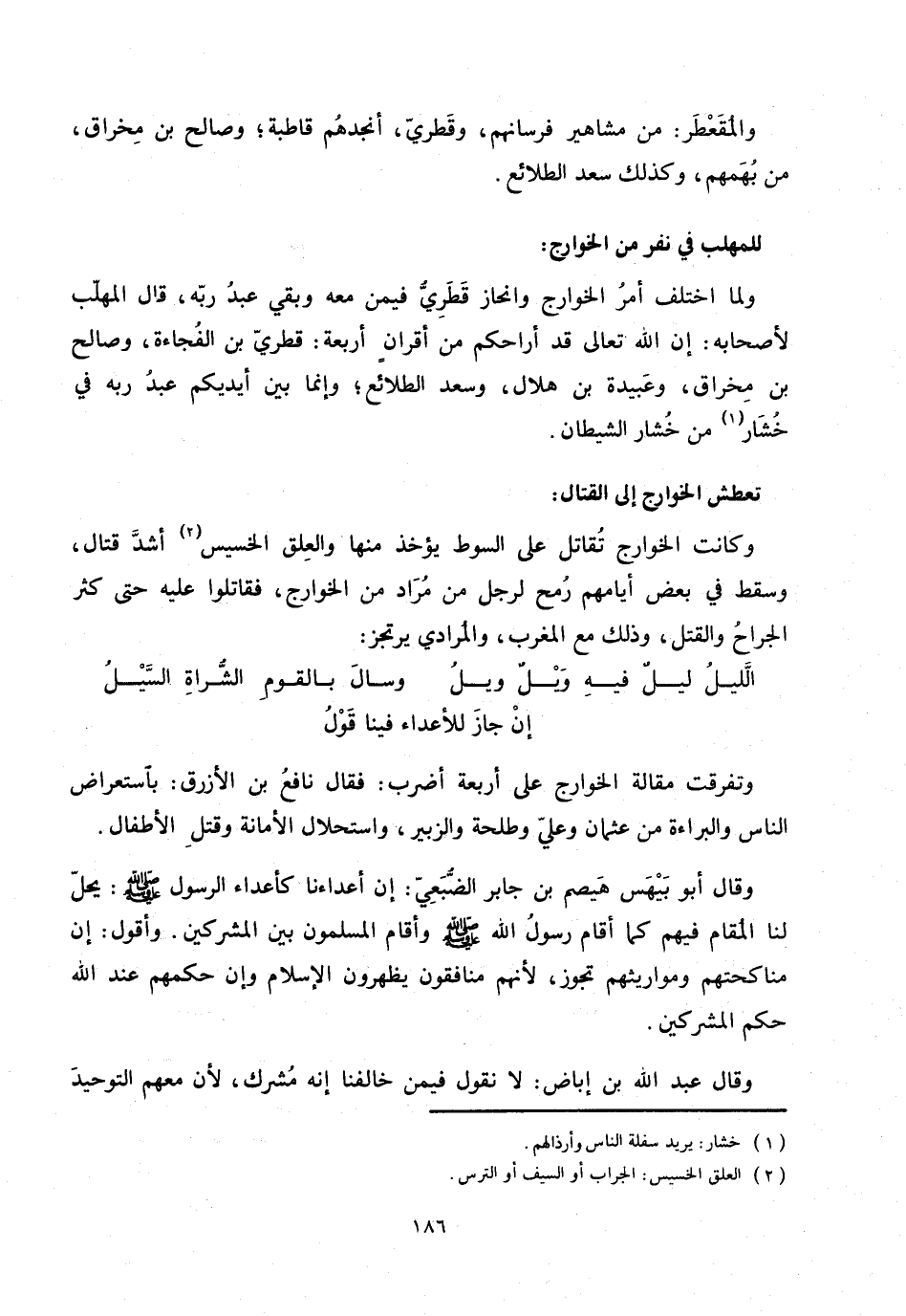 : وكانت الخوارج تقاتل على السوط يؤخذ منها والعلق الخسيس «2» أشدّ قتال، وسقط في بعض أيامهم رمح لرجل من مراد من الخوارج، فقاتلوا عليه حتى كثر الجراح والقتل، وذلك مع المغرب، والمرادي يرتجز: