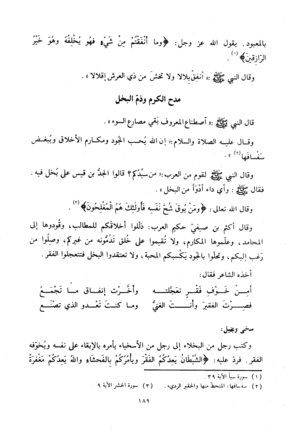 : وكتب رجل من البخلاء إلى رجل من الأسخياء يأمره بالإبقاء على نفسه ويخوّفه الفقر. فردّ عليه: الشَّيْطانُ يَعِدُكُمُ الْفَقْرَ وَيَأْمُرُكُمْ بِالْفَحْشاءِ وَاللَّهُ يَعِدُكُمْ مَغْفِرَةً