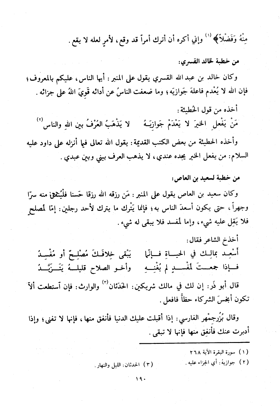 : وكان خالد بن عبد الله القسري يقول على المنبر: أيها الناس، عليكم بالمعروف؛ فإن الله لا يعدم فاعله جوازيه؛ وما ضعفت الناس عن أدائه قوي الله على جزائه.