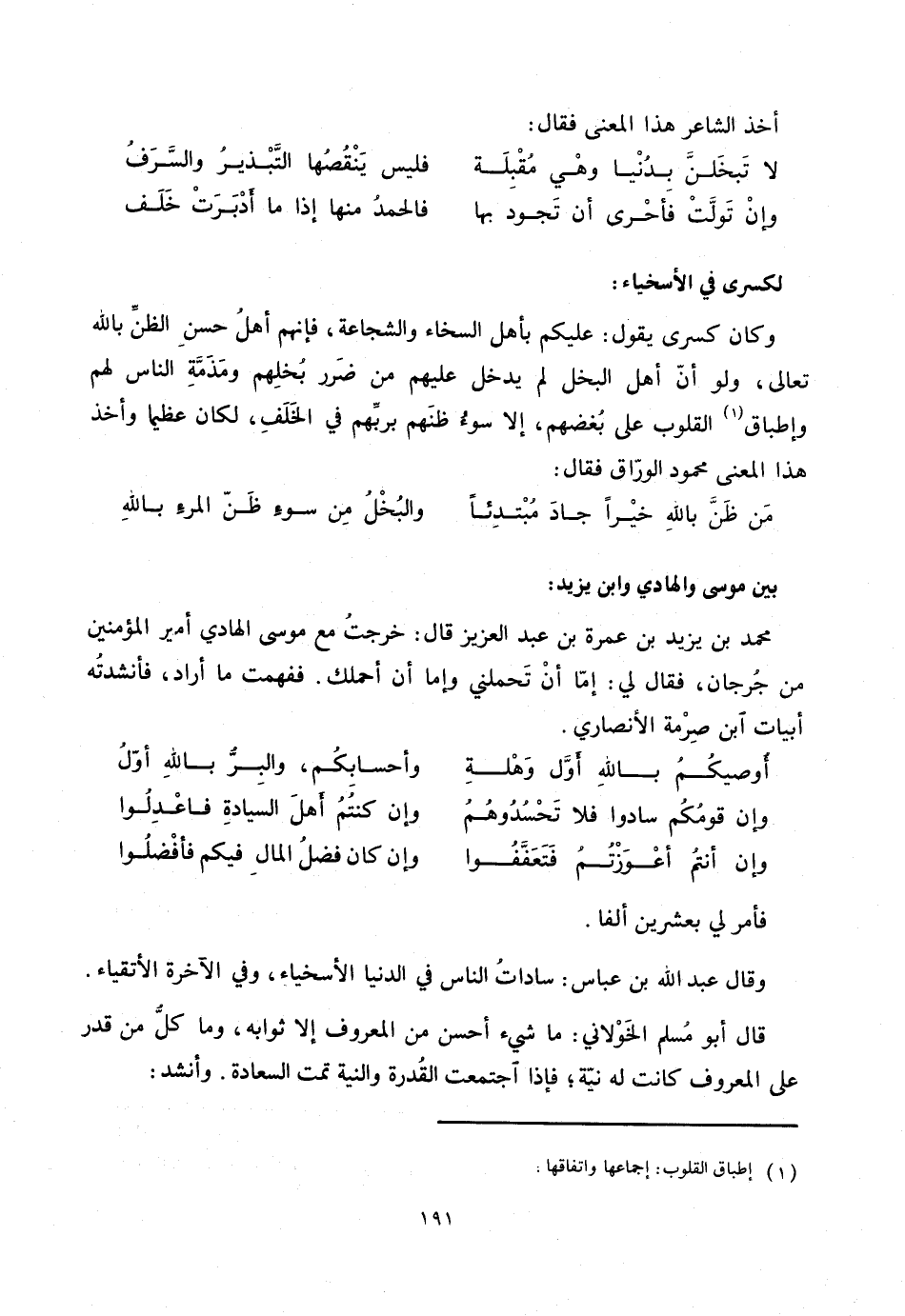 : وكان كسرى يقول: عليكم بأهل السخاء والشجاعة، فإنهم أهل حسن الظنّ بالله تعالى، ولو أنّ أهل البخل لم يدخل عليهم من ضرر بخلهم ومذمّة الناس لهم وإطباق «1» القلوب على بغضهم، إلا سوء ظنهم بربّهم في الخلف، لكان عظيما وأخذ هذا المعنى محمود الورّاق فقال: