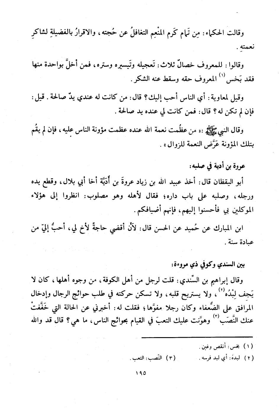 : وقال إبراهيم بن السّندي: قالت لرجل من أهل الكوفة، من وجوه أهلها، كان لا يجف لبده «2» ، ولا يستريح قلبه، ولا تسكن حركته في طلب حوائج الرجال وإدخال المرافق على الضّعفاء وكان رجلا مفوّها؛ فقلت له: أخبرني عن الحالة التي خفّفت عنك النّصب «3» وهوّنت عليك التعب في القيام بحوائج الناس، ما هي؟ قال قد والله