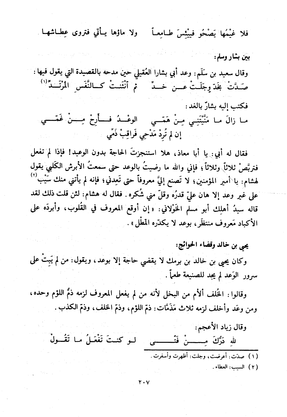 فقال له أبي: يا أبا معاذ، هلا استنجزت الحاجة بدون الوعيد! فإذا لم تفعل فتربّص ثلاثا وثلاثا؛ فإني والله ما رضيت بالوعد حتى سمعت الأبرش الكلبي يقول لهشام: يا أمير المؤمنين؛ لا تصنع إليّ معروفا حتى تعدني؛ فإنه لم يأتني منك سيب «2» على غير وعد إلا هان عليّ قدره وقلّ مني شكره. فقال له هشام: لئن قلت ذلك لقد قاله سيد أهلك أبو مسلم الخولاني: «إن أوقع المعروف في القلوب، وأبرده على الأكباد معروف منتظر، بوعد لا يكدّره المطل» .