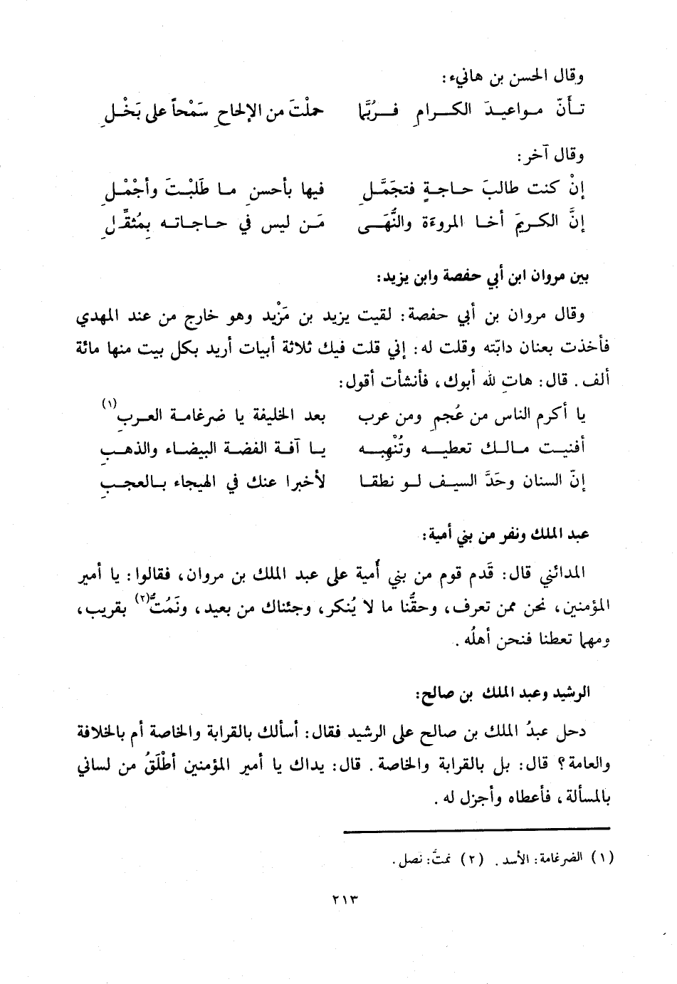 : وقال مروان بن أبي حفصة: لقيت يزيد بن مزيد وهو خارج من عند المهدي فأخذت بعنان دابّته وقلت له: إني قلت فيك ثلاثة أبيات أريد بكل بيت منها مائة ألف. قال: هات لله أبوك، فأنشأت أقول: