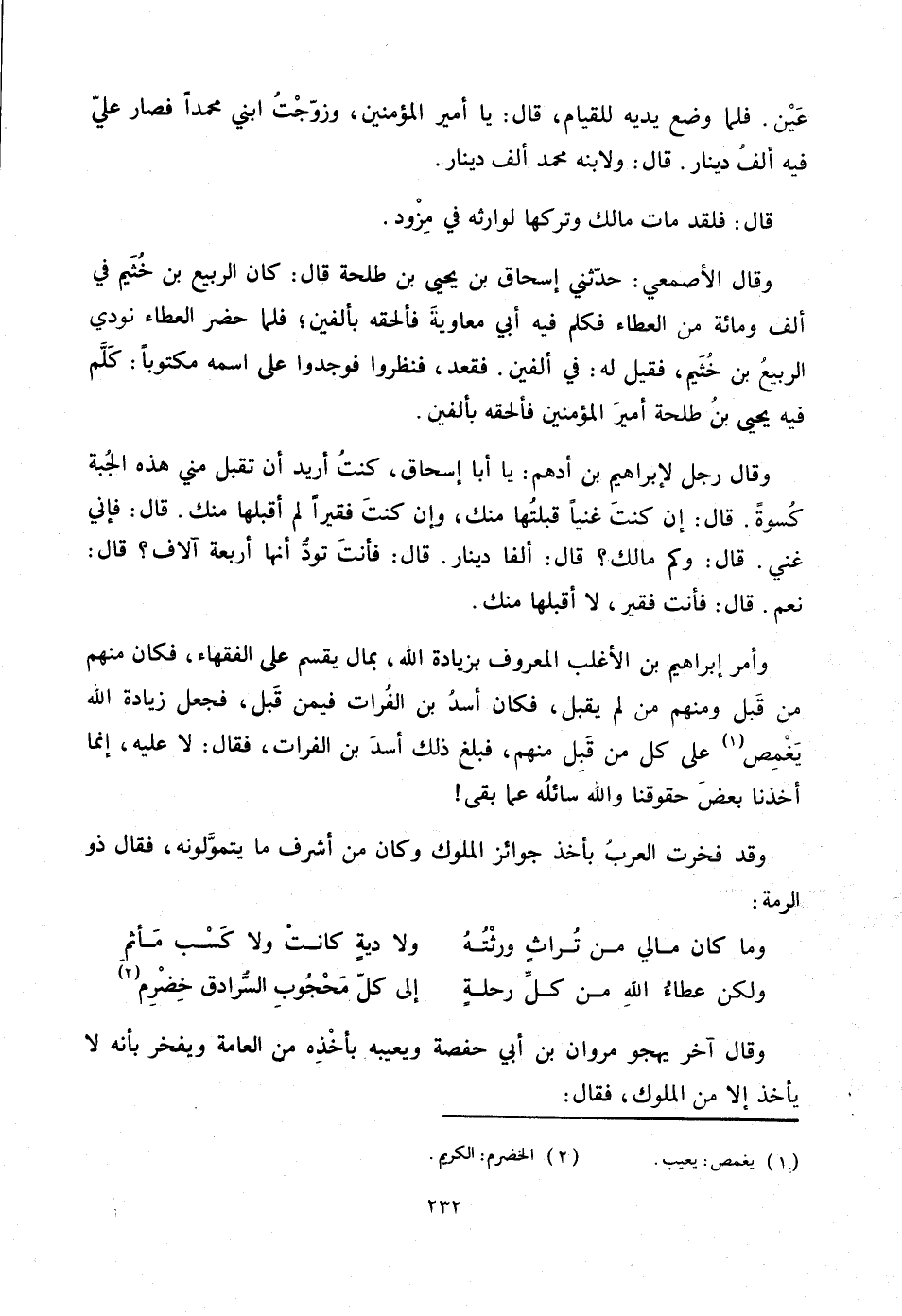 وأمر إبراهيم بن الأغلب المعروف بزيادة الله، بمال يقسم على الفقهاء، فكان منهم من قبل ومنهم من لم يقبل، فكان أسد بن الفرات فيمن قبل، فجعل زيادة الله يغمص «1» على كل من قبل منهم، فبلغ ذلك أسد بن الفرات، فقال: لا عليه، إنما أخذنا بعض حقوقنا والله سائله عما بقى! وقد فخرت العرب بأخذ جوائز الملوك وكان من أشرف ما يتموّلونه، فقال ذو الرمة: