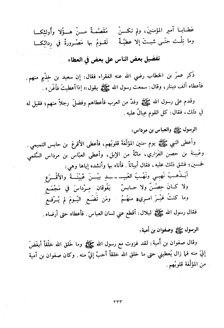 وعيينة بن حصن الفزاري، مائة من الإبل، وأعطى العبّاس بن مرداس السّلمي خمسين؛ فشق ذلك عليه، فقال أبياتا. فأتاه بها وأنشده إياها وهي: