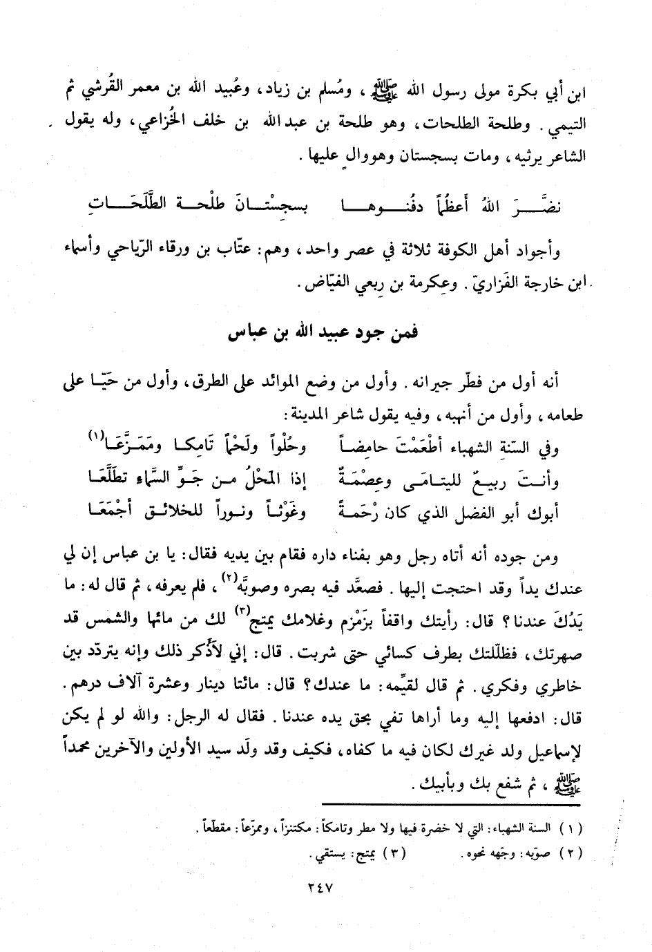 ومن جوده أنه أتاه رجل وهو بفناء داره فقام بين يديه فقال: يا بن عباس إن لي عندك يدا وقد احتجت إليها. فصعّد فيه بصره وصوبّه «2» ، فلم يعرفه، ثم قال له: ما يدك عندنا؟ قال: رأيتك واقفا بزمزم وغلامك يمتج «3» لك من مائها والشمس قد صهرتك، فظلّلتك بطرف كسائي حتى شربت. قال: إني لأذكر ذلك وإنه يتردّد بين خاطري وفكري. ثم قال لقيّمه: ما عندك؟ قال: مائتا دينار وعشرة آلاف درهم.