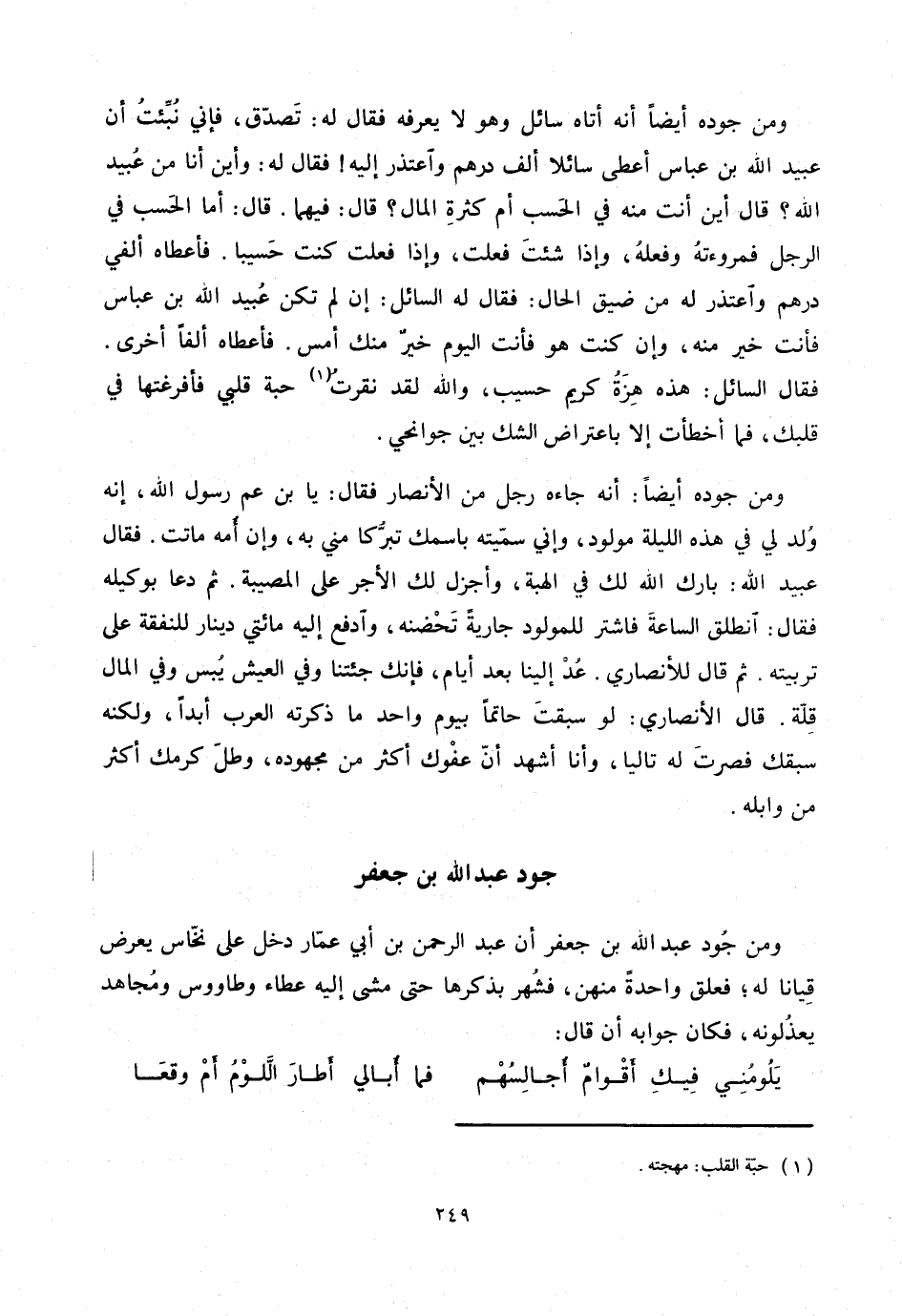 فقال السائل: هذه هزة كريم حسيب، والله لقد نقرت «1» حبة قلبي فأفرغتها في قلبك، فما أخطأت إلا باعتراض الشك بين جوانحي.