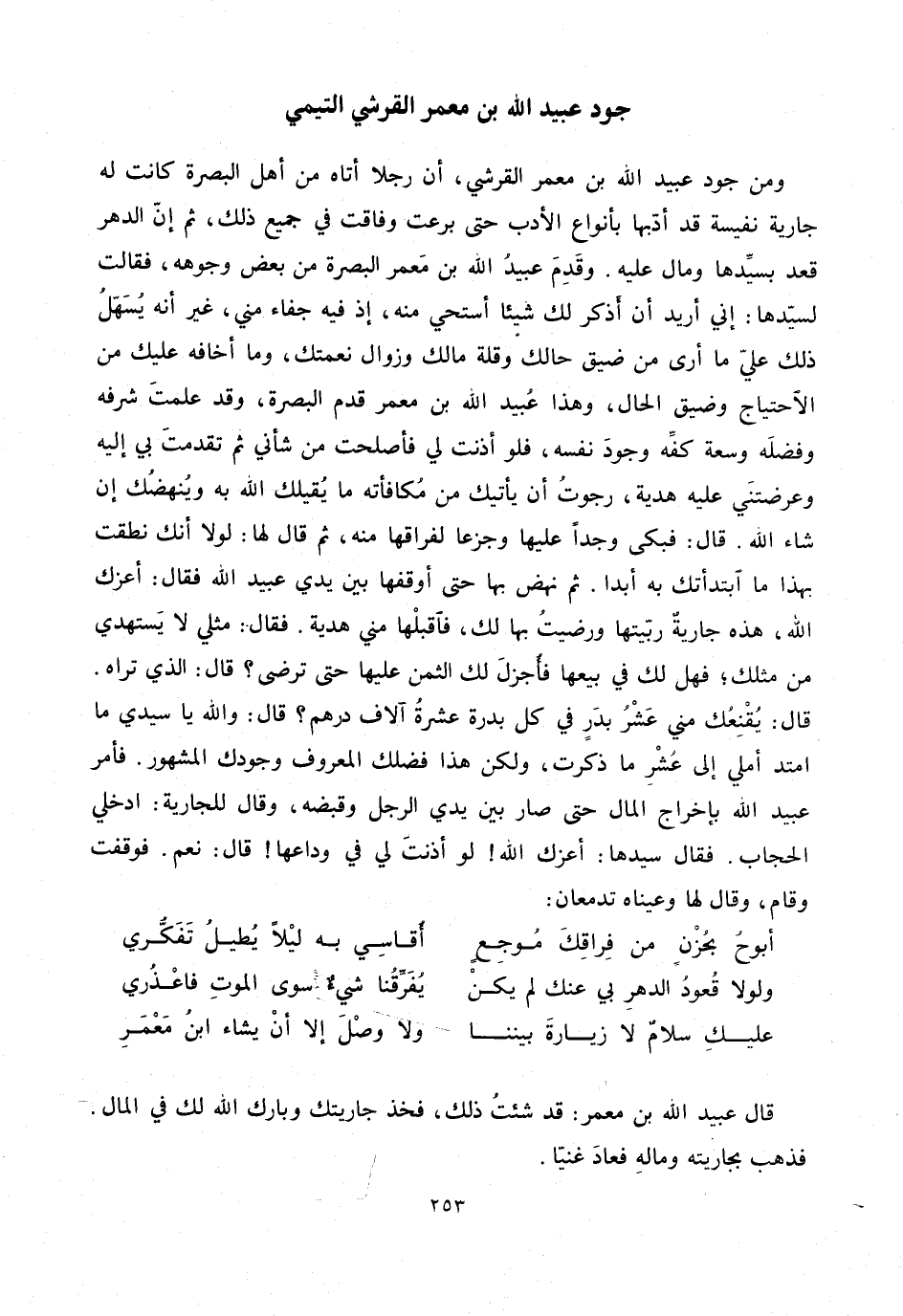 ومن جود عبيد الله بن معمر القرشي، أن رجلا أتاه من أهل البصرة كانت له جارية نفيسة قد أدّبها بأنواع الأدب حتى برعت وفاقت في جميع ذلك، ثم إنّ الدهر قعد بسيّدها ومال عليه. وقدم عبيد الله بن معمر البصرة من بعض وجوهه، فقالت لسيّدها: إني أريد أن أذكر لك شيئا أستحي منه، إذ فيه جفاء مني، غير أنه يسهّل ذلك عليّ ما أرى من ضيق حالك وقلة مالك وزوال نعمتك، وما أخافه عليك من الاحتياج وضيق الحال، وهذا عبيد الله بن معمر قدم البصرة، وقد علمت شرفه وفضله وسعة كفّه وجود نفسه، فلو أذنت لي فأصلحت من شأني ثم تقدمت بي إليه وعرضتني عليه هدية، رجوت أن يأتيك من مكافأته ما يقيلك الله به وينهضك إن شاء الله. قال: فبكى وجدا عليها وجزعا لفراقها منه، ثم قال لها: لولا أنك نطقت بهذا ما ابتدأتك به أبدا. ثم نهض بها حتى أوقفها بين يدي عبيد الله فقال: أعزك الله، هذه ارية ربّيتها ورضيت بها لك، فاقبلها مني هدية. فقال: مثلي لا يستهدي من مثلك؛ فهل لك في بيعها فأجزل لك الثمن عليها حتى ترضى؟ قال: الذي تراه.