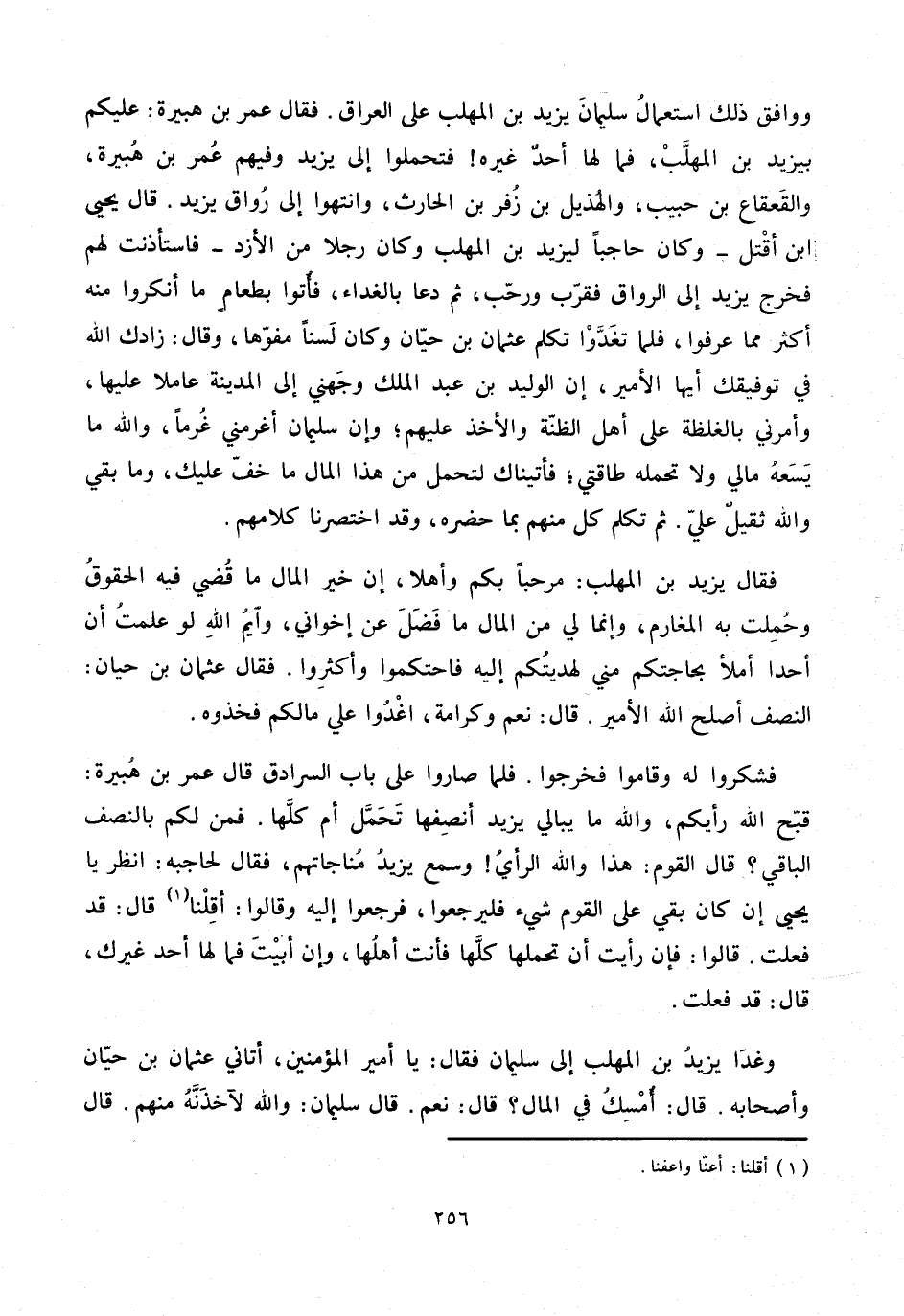 ووافق ذلك استعمال سليمان يزيد بن المهلب على العراق. فقال عمر بن هبيرة: عليكم بيزيد بن المهلّب، فما لها أحد غيره! فتحملوا إلى يزيد وفيهم عمر بن هبيرة، والقعقاع بن حبيب، والهذيل بن زفر بن الحارث، وانتهوا إلى رواق يزيد. قال يحيى ابن أقتل- وكان حاجبا ليزيد بن المهلب وكان رجلا من الأزد- فاستأذنت لهم فخرج يزيد إلى الرواق فقرّب ورحّب، ثم دعا بالغداء، فأتوا بطعام ما أنكروا منه أكثر مما عرفوا، فلما تغدّوا تكلم عثمان بن حيّان وكان لسنا مفوّها، وقال: زادك الله في توفيقك أيها الأمير، إن الوليد بن عبد الملك وجهني إلى المدينة عاملا عليها، وأمرني بالغلظة على أهل الظنّة والأخذ عليهم؛ وإن سليمان أغرمني غرما، والله ما يسعه مالي ولا تحمله طاقتي؛ فأتيناك لتحمل من هذا المال ما خفّ عليك، وما بقي والله ثقيل عليّ. ثم تكلم كل منهم بما حضره، وقد اختصرنا كلامهم.