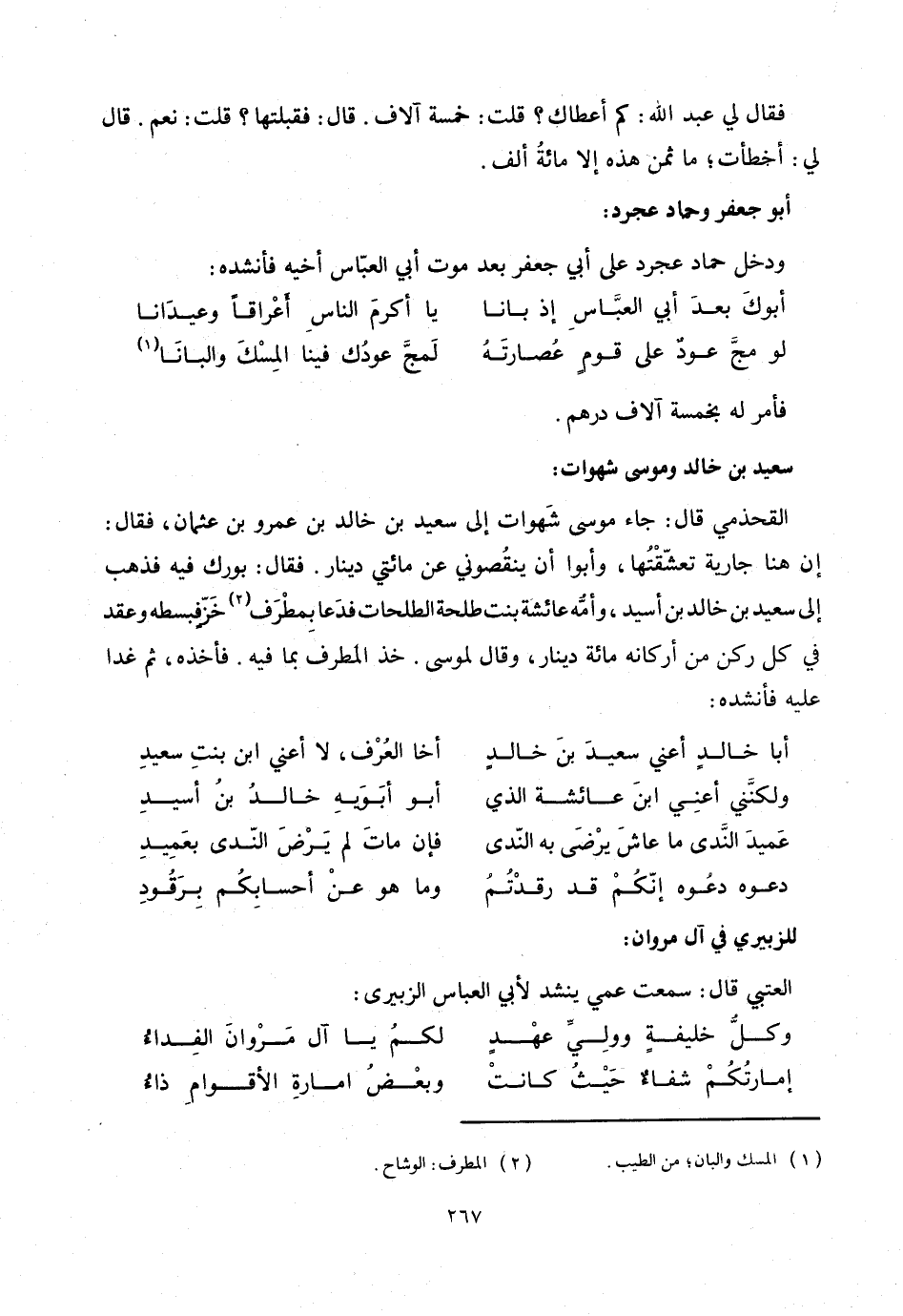 إن هنا جارية تعشّقتها، وأبوا أن ينقصوني عن مائتي دينار. فقال: بورك فيه فذهب إلى سعيد بن خالد بن أسيد، وأمّه عائشة بنت طلحة الطلحات فدعا بمطرف «2» خزّ فبسطه وعقد في كل ركن من أركانه مائة دينار، وقال لموسى. خذ المطرف بما فيه. فأخذه، ثم غدا عليه فأنشده: