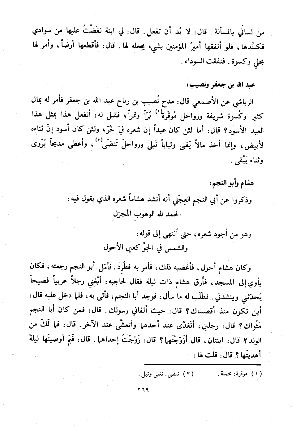 : الرياشي عن الأصمعي قال: مدح نصيب بن رباح عبد الله بن جعفر فأمر له بمال كثير وكسوة شريفة ورواحل موقرة «1» برّا وتمرا؛ فقيل له: أتفعل هذا بمثل هذا العبد الأسود؟ قال: أما لئن كان عبدا إن شعره فيّ لحرّ؛ ولئن كان أسود إنّ ثناءه لأبيض، وإنما أخذ مالا يفنى وثيابا تبلى ورواحل تنضى «2» ، وأعطى مديحا يروى وثناء يبقى.