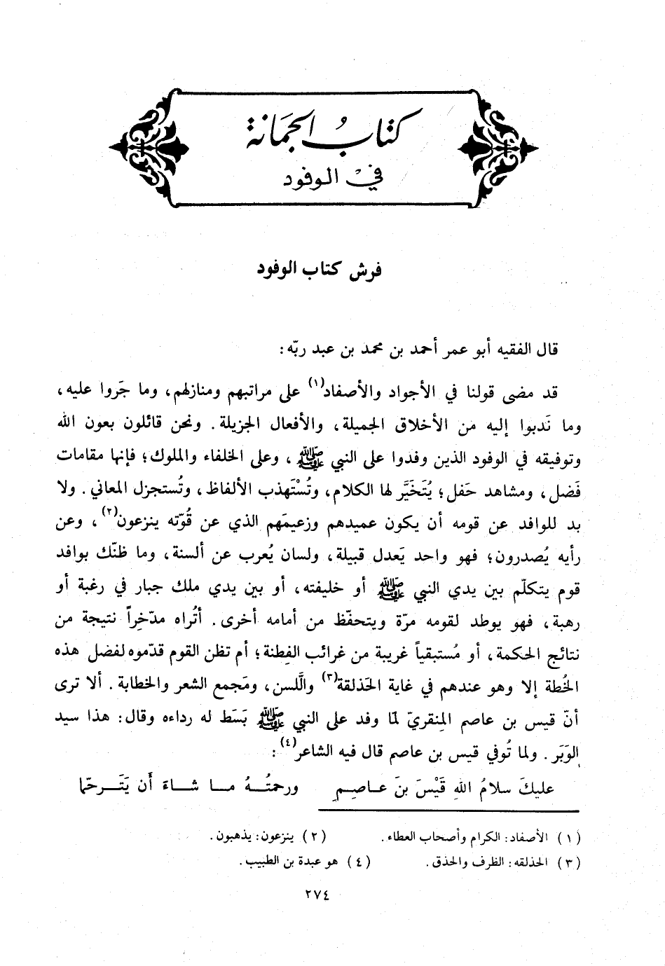 قد مضى قولنا في الأجواد والأصفاد «1» على مراتبهم ومنازلهم، وما جروا عليه، وما ندبوا إليه من الأخلاق الجميلة، والأفعال الجزيلة. ونحن قائلون بعون الله وتوفيقه في الوفود الذين وفدوا على النبي صلّى الله عليه وسلّم، وعلى الخلفاء والملوك؛ فإنها مقامات فضل، ومشاهد حفل؛ يتخيّر لها الكلام، وتستهذب الألفاظ، وتستجزل المعاني. ولا بد للوافد عن قومه أن يكون عميدهم وزعيمهم الذي عن قوّته ينزعون «2» ، وعن رأيه يصدرون؛ فهو واحد يعدل قبيلة، ولسان يعرب عن ألسنة، وما ظنّك بوافد قوم يتكلّم بين يدي النبي صلّى الله عليه وسلّم أو خليفته، أو بين يدي ملك جبار في رغبة أو رهبة، فهو يوطد لقومه مرّة ويتحفّظ من أمامه أخرى. أتراه مدّخرا نتيجة من نتائج الحكمة، أو مستبقيا غريبة من غرائب الفطنة؛ أم تظن القوم قدّموه لفضل هذه الخطة إلا وهو عندهم في غاية الحذلقة «3» والّلسن، ومجمع الشعر والخطابة. ألا ترى أنّ قيس بن عاصم المنقريّ لمّا وفد على النبي صلّى الله عليه وسلّم بسط له رداءه وقال: هذا سيد الوبر. ولما توفي قيس بن عاصم قال فيه الشاعر «4» :