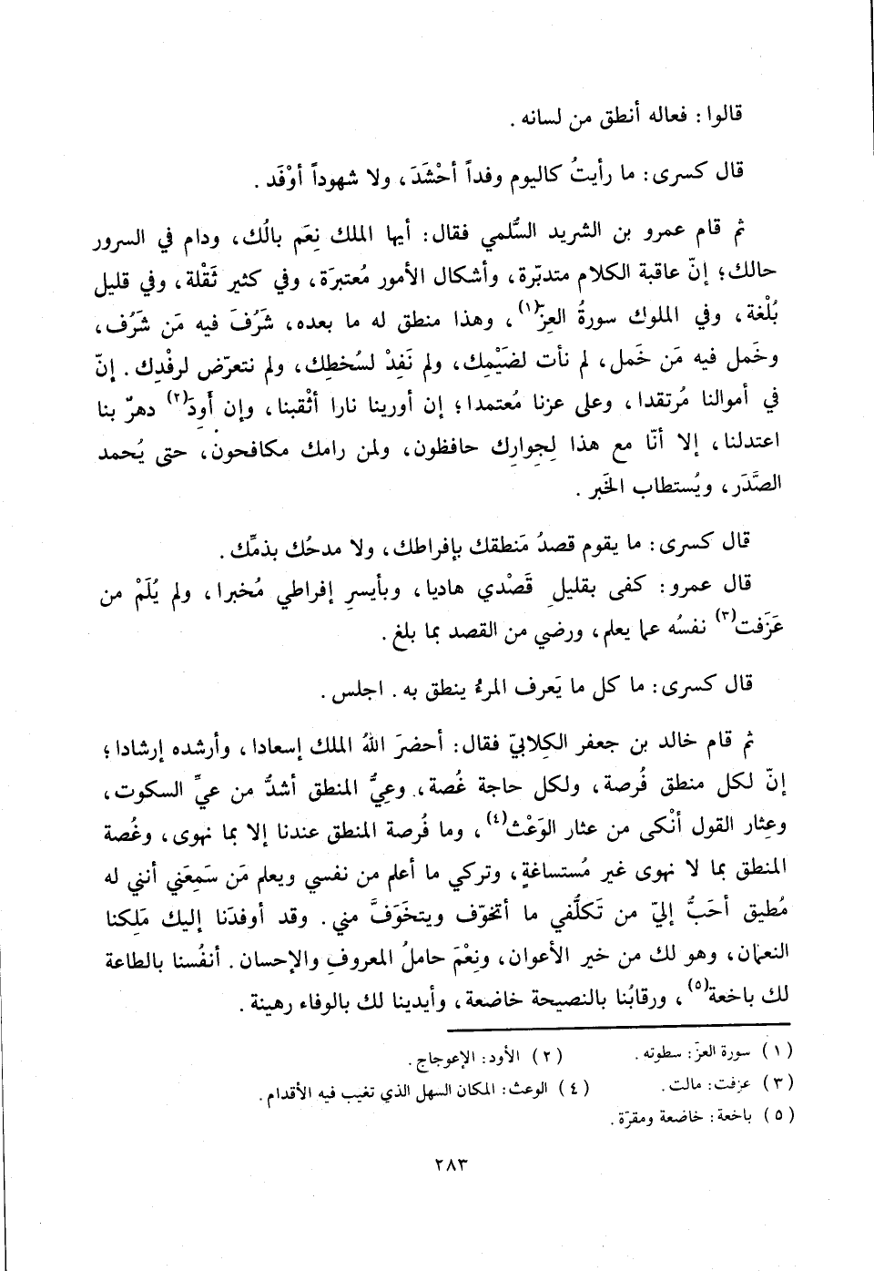 ثم قام خالد بن جعفر الكلابيّ فقال: أحضر الله الملك إسعادا، وأرشده إرشادا؛ إنّ لكل منطق فرصة، ولكل حاجة غصة، وعيّ المنطق أشدّ من عيّ السكوت، وعثار القول أنكى من عثار الوعث «4» ، وما فرصة المنطق عندنا إلا بما نهوى، وغصة المنطق بما لا نهوى غير مستساغة، وتركي ما أعلم من نفسي ويعلم من سمعني أنني له مطيق أحبّ إليّ من تكلّفي ما أتخوّف ويتخوفّ مني. وقد أوفدنا إليك ملكنا النعمان، وهو لك من خير الأعوان، ونعم حامل المعروف والإحسان. أنفسنا بالطاعة لك باخعة «5» ، ورقابنا بالنصيحة خاضعة، وأيدينا لك بالوفاء رهينة.