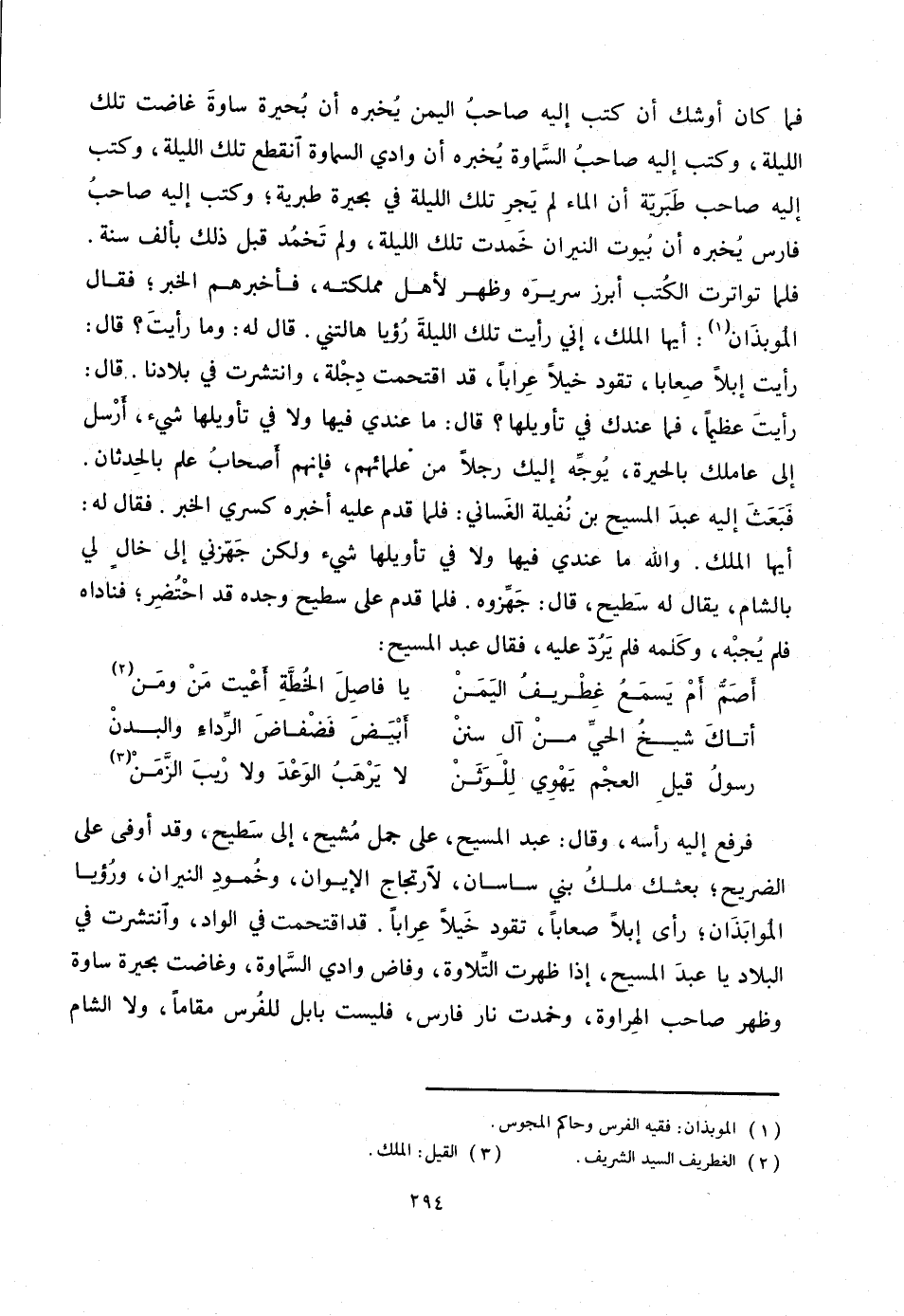فرفع إليه رأسه، وقال: عبد المسيح، على جمل مشيح، إلى سطيح، وقد أوفى على الضريح؛ بعثك ملك بني ساسان، لارتجاج الإيوان، وخمود النيران، ورؤيا الموابذان؛ رأى إبلا صعابا، تقود خيلا عرابا. قد اقتحمت في الواد، وانتشرت في البلاد يا عبد المسيح، إذا ظهرت التّلاوة، وفاض وادي السّماوة، وغاضت بحيرة ساوة وظهر صاحب الهراوة، وخمدت نار فارس، فليست بابل للفرس مقاما، ولا الشام