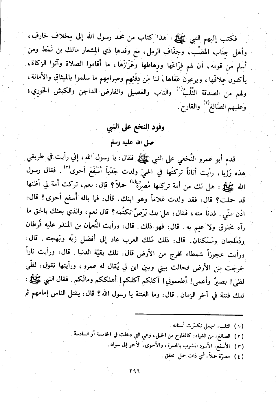 فكتب إليهم النبي صلّى الله عليه وسلّم: هذا كتاب من محمد رسول الله إلى مخلاف خارف، وأهل جناب الهضب، وجفاف الرمل، مع وفدها ذي المشعار مالك بن نمط ومن أسلم من قومه، أن لهم فراعها ووهاطها وعزازها، ما أقاموا الصلاة وآتوا الزكاة، يأكلون علافها، ويرعون عفاها، لنا من دفئهم وصرامهم ما سلموا بالميثاق والأمانة، ولهم من الصدقة الثّلب «1»