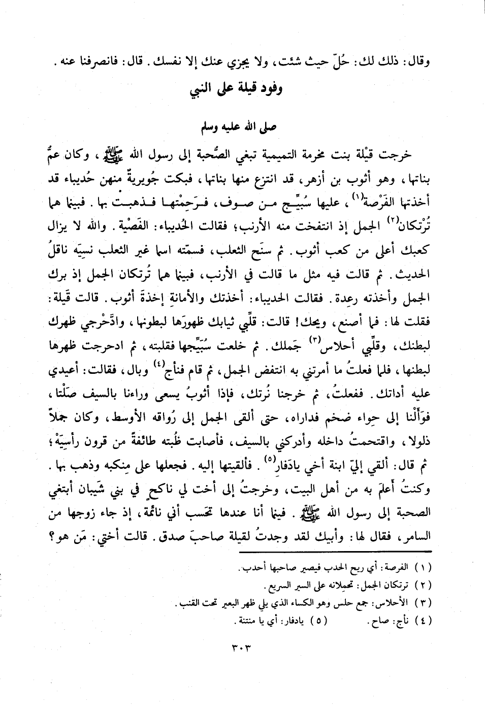 وكنت أعلم به من أهل البيت، وخرجت إلى أخت لي ناكح في بني شيبان أبتغي الصحبة إلى رسول الله صلّى الله عليه وسلّم. فينما أنا عندها تحسب أني نائمة، إذ جاء زوجها من السامر، فقال لها: وأبيك لقد وجدت لقيلة صاحب صدق. قالت أختي: من هو؟