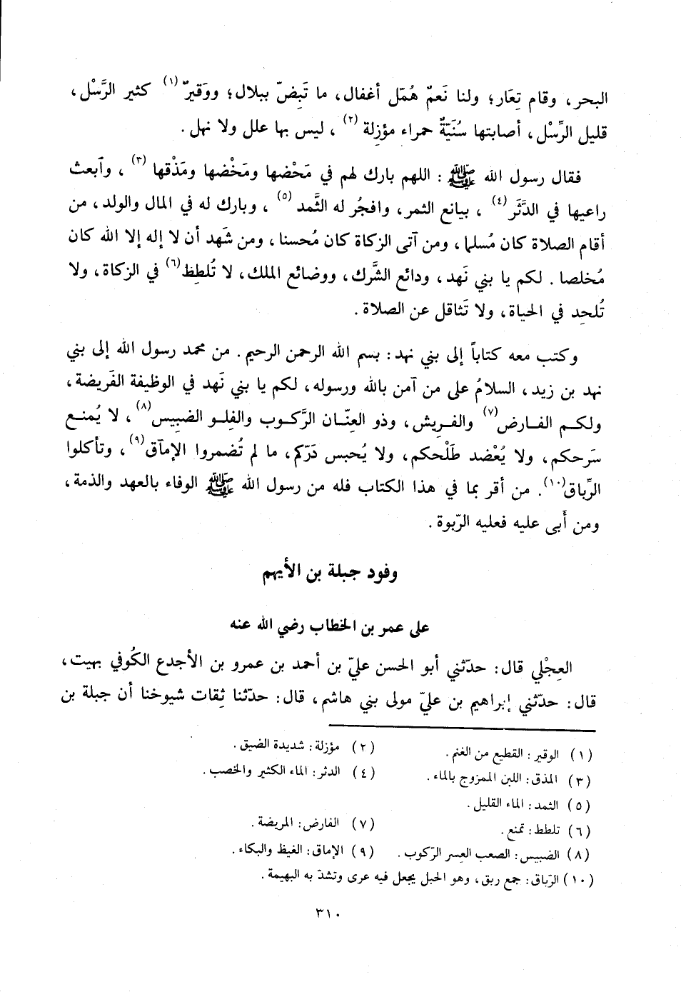 وكتب معه كتابا إلى بني نهد: بسم الله الرحمن الرحيم. من محمد رسول الله إلى بني نهد بن زيد، السلام على من آمن بالله ورسوله، لكم يا بني نهد في الوظيفة الفريضة، ولكم الفارض «7» والفريش، وذو العنّان الرّكوب والفلو الضبيس «8» ، لا يمنع سرحكم، ولا يعضد طلحكم، ولا يحبس درّكم، ما لم تضمروا الإمآق «9» ، وتأكلوا الرّباق «10» . من أقر بما في هذا الكتاب فله من رسول الله صلّى الله عليه وسلّم الوفاء بالعهد والذمة، ومن أبى عليه فعليه الرّبوة.