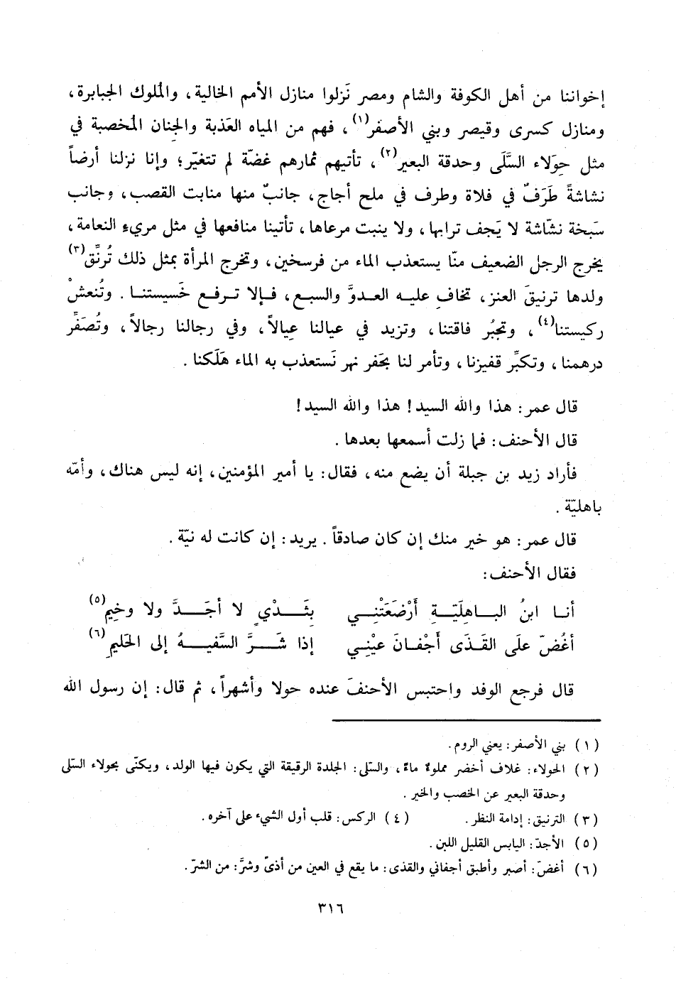 قال فرجع الوفد واحتبس الأحنف عنده حولا وأشهرا، ثم قال: إن رسول الله