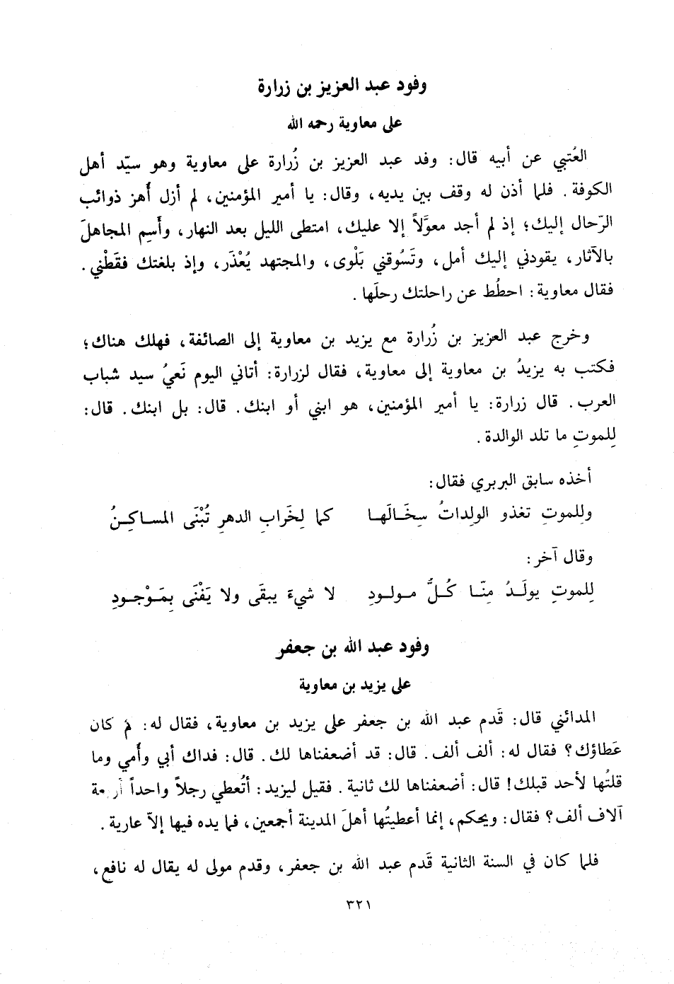 المدائني قال: قدم عبد الله بن جعفر على يزيد بن معاوية، فقال له: كم كان عطاؤك؟ فقال له: ألف ألف. قال: قد أضعفناها لك. قال: فداك أبي وأمي وما قلتها لأحد قبلك! قال: أضعفناها لك ثانية. فقيل ليزيد: أتعطي رجلا واحدا أربعة آلاف ألف؟ فقال: ويحكم، إنما أعطيتها أهل المدينة أجمعين، فما يده فيها إلّا عارية.