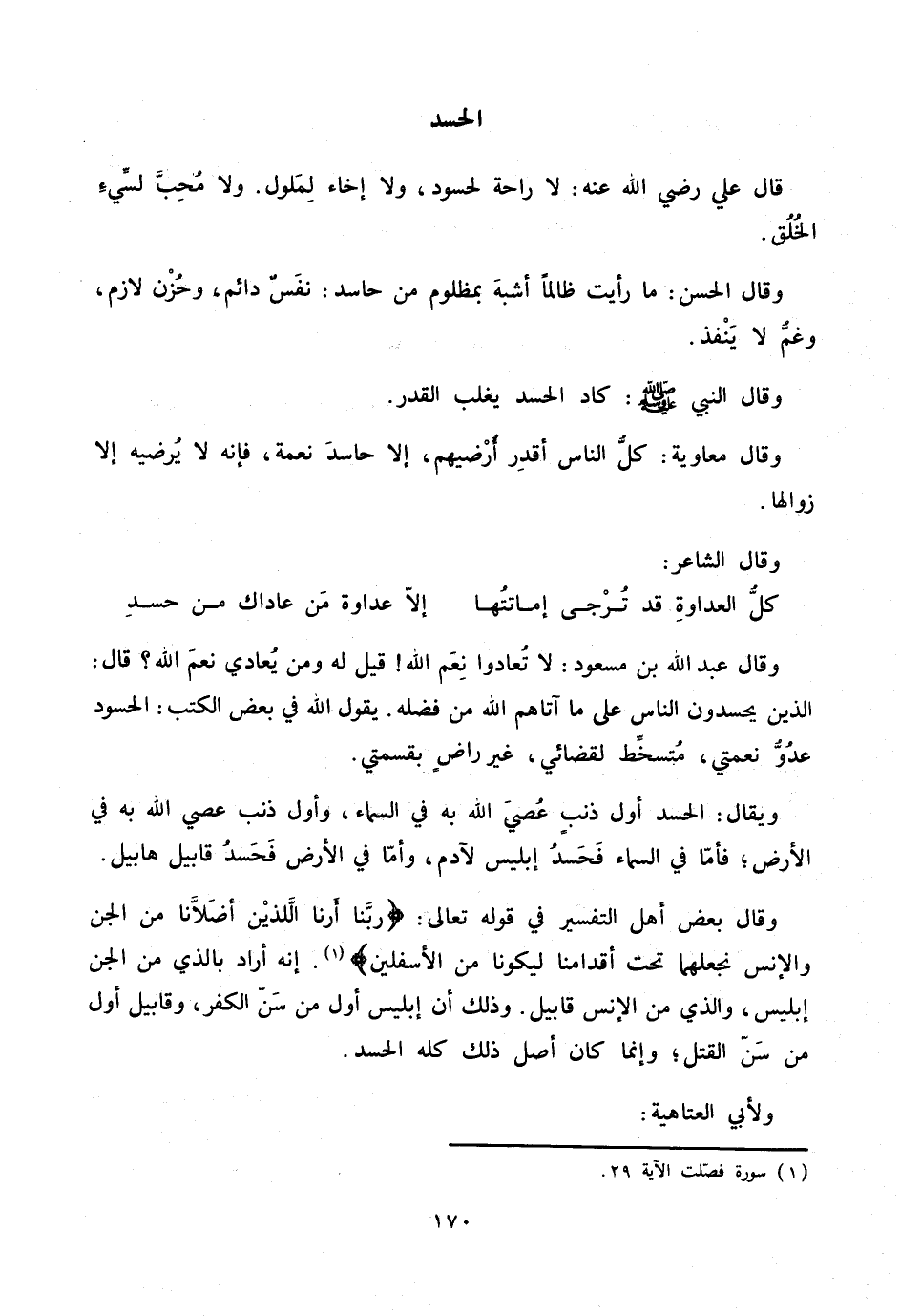 وقال الحسن: ما رأيت ظالما أشبه بمظلوم من حاسد: نفس دائم، وحزن لازم، وغمّ لا ينفذ.