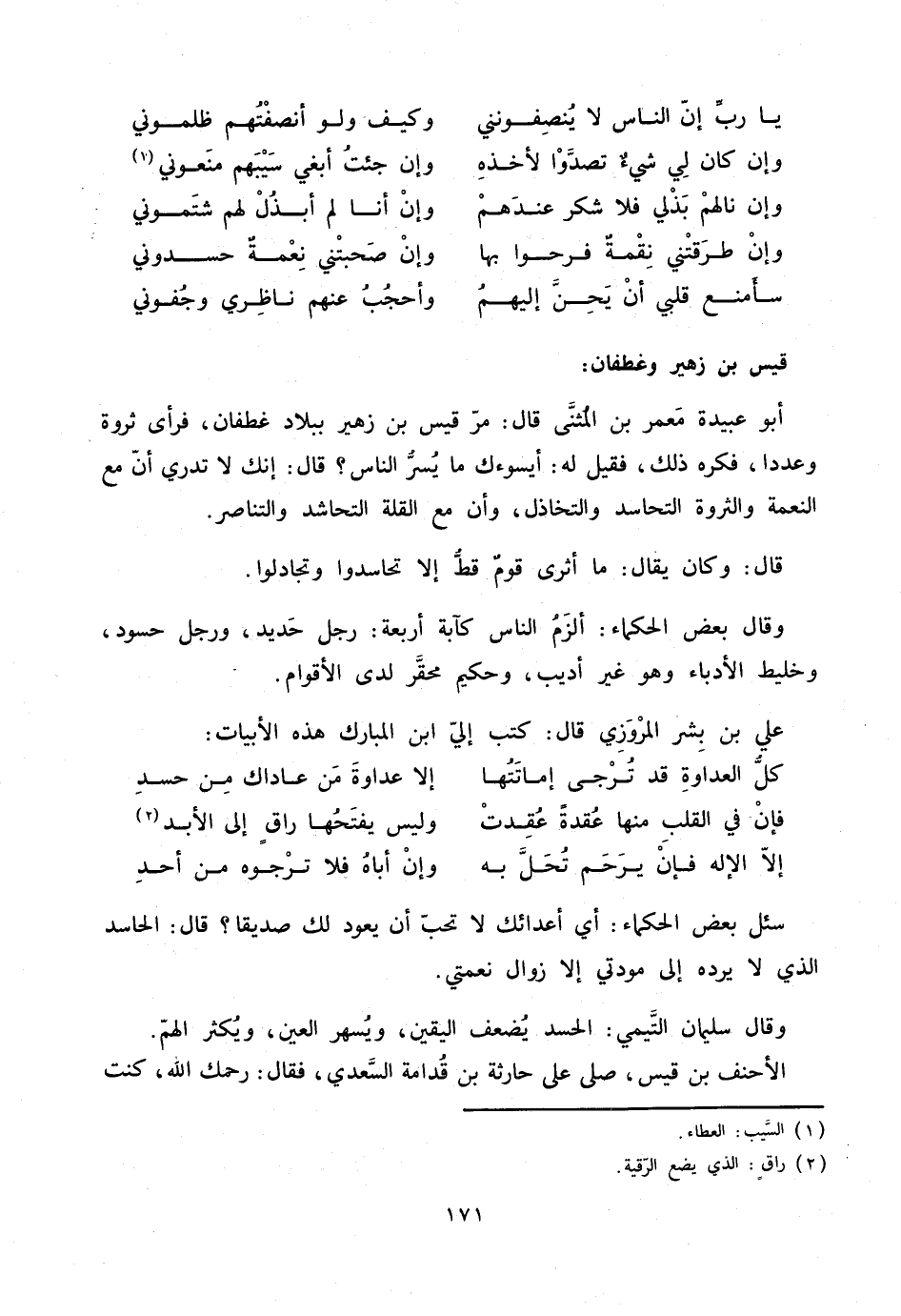 أبو عبيدة معمر بن المثنّى قال: مرّ قيس بن زهير ببلاد غطفان، فرأى ثروة وعددا، فكره ذلك، فقيل له: أيسوءك ما يسرّ الناس؟ قال: إنك لا تدري أنّ مع النعمة والثروة التحاسد والتخاذل، وأن مع القلة التحاشد والتناصر.